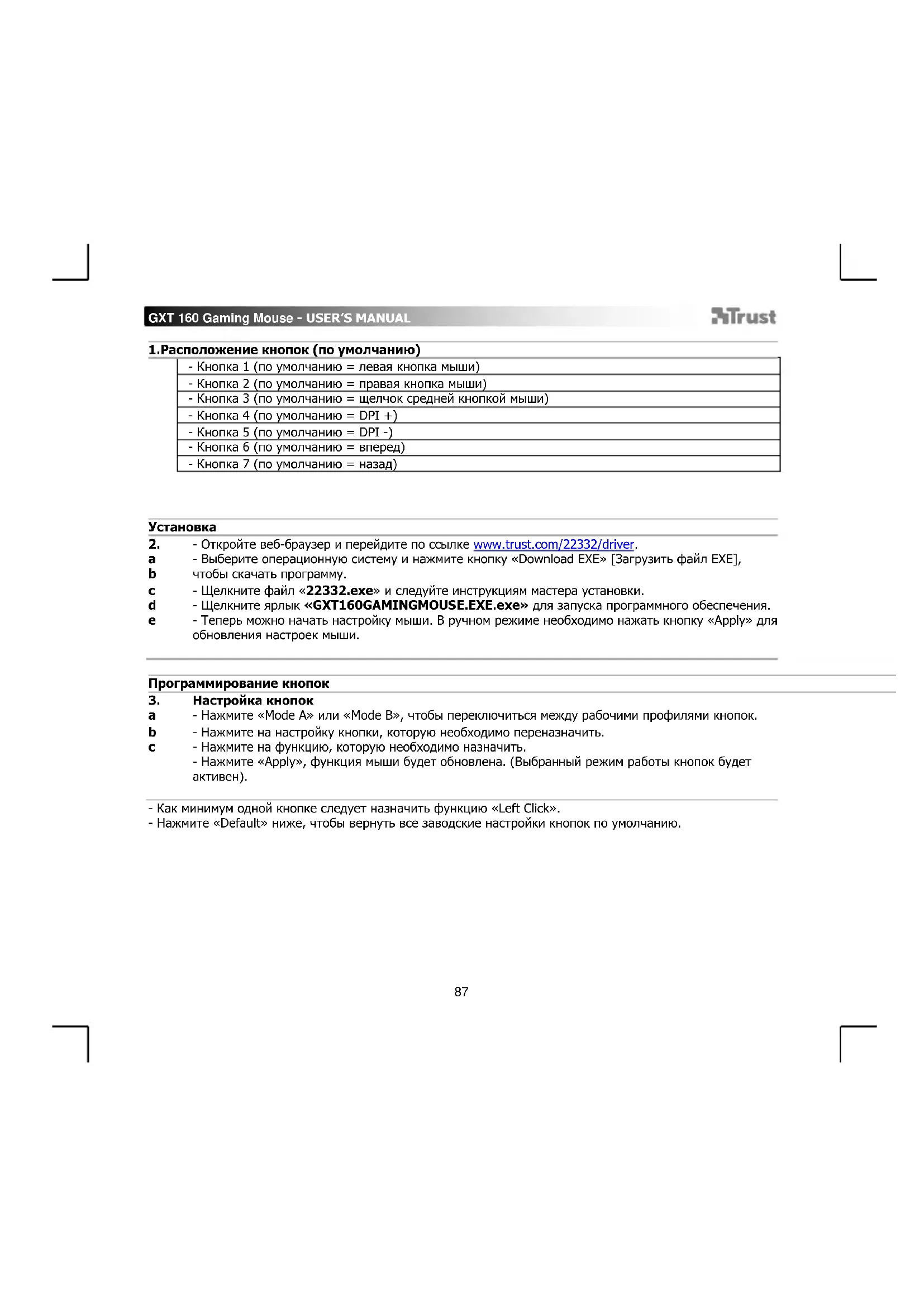 Если возникшую проблему не удалось решить, обратитесь в службу технической поддержки www.trust.com/22332/faq.GXT 160 Gaming Mouse - USER’S MANUAL