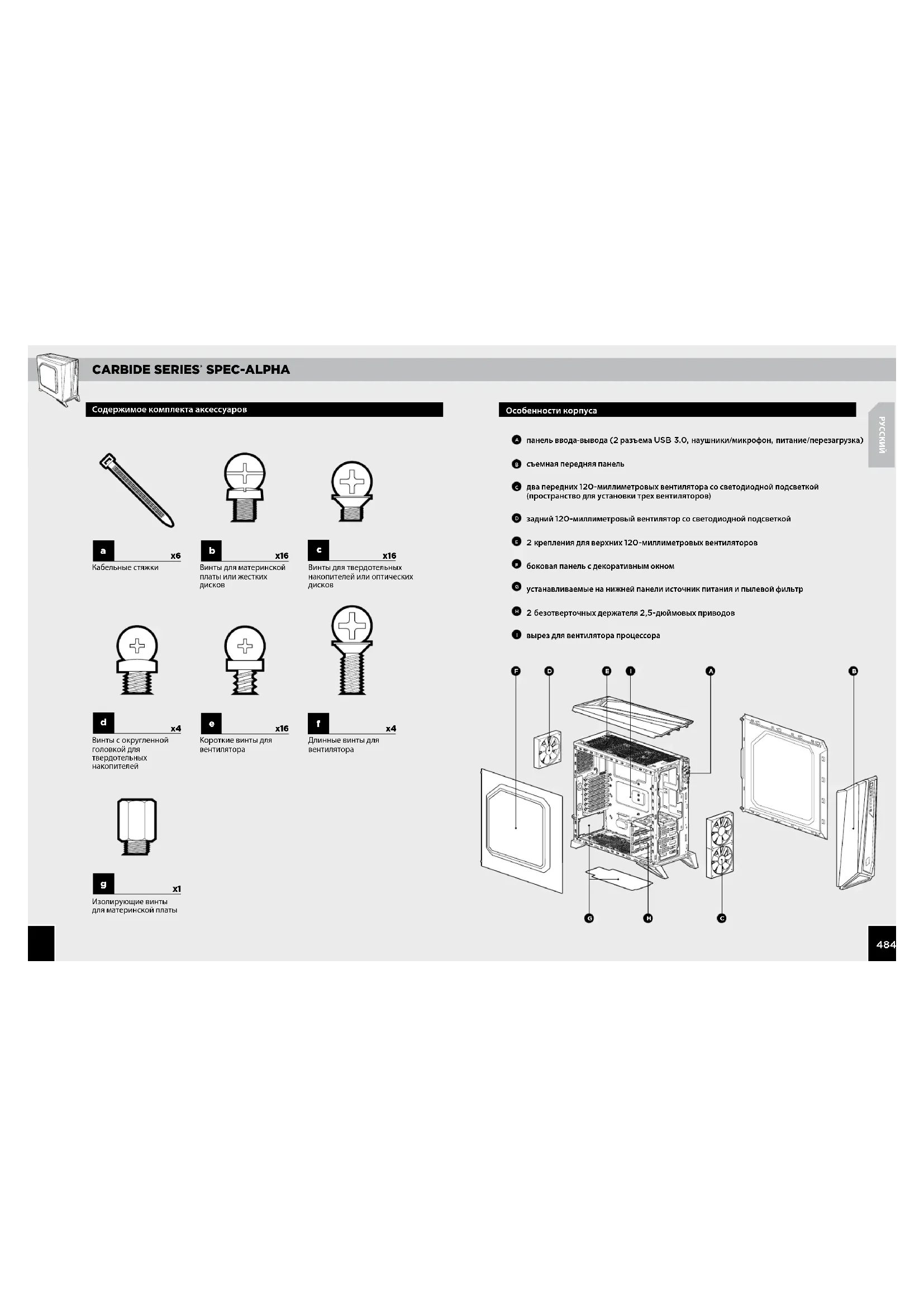 SPEC-ALPHA5251РУССКИЙ8. Установка дополнительных твердотельных накопителей7. Установка жестких дисков и твердотельных накопителей6. Снятие верхней панели5. Снятие передней панелиПросто потяните фиксатор назад и задвигайте 2,5-дюймовый твердотельный накопитель или 3,5-дюймовый жесткий диск, пока фиксатор не защелкнется на месте.Поместите привод 2,5 дюйма на среднюю панель корпуса и закрепите входящими в комплект винтами из коробки для аксессуаров. SPEC-ALPHA STEP5 SPEC-ALPHA Step 8 SPEC-ALPHA STEP6 SPEC-ALPHA Step 7 SPEC-ALPHA Step 7 Чтобы снять переднюю панель, осторожно сдвиньте ее с корпуса, надавив на фиксирующие защелки. Извлеките винты из верхней задней части корпуса и осторожно сдвигайте верхнюю панель назад, пока не снимете ее.CARBIDE SERIES