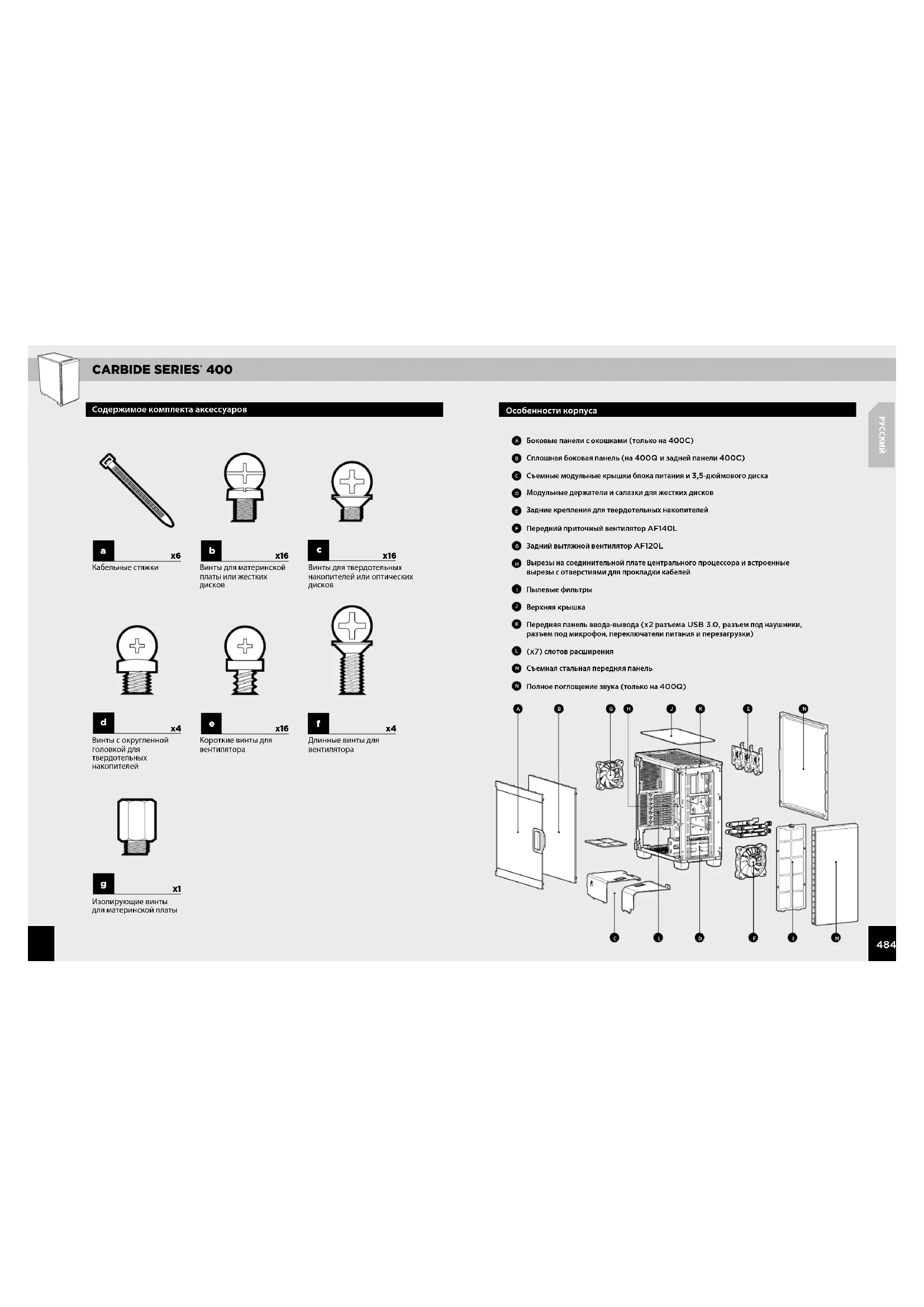 Особенности корпуса Содержимое комплекта аксессуаров Боковые панели с окошками (только на 400C) Сплошная боковая панель (на 400Q и задней панели 400C) Съемные модульные крышки блока питания и 3,5-дюймового диска Модульные держатели и салазки для жестких дисков Задние крепления для твердотельных накопителей Передний приточный вентилятор AF140L Задний вытяжной вентилятор AF120L Вырезы на соединительной плате центрального процессора и встроенные вырезы с отверстиями для прокладки кабелей Пылевые фильтры Верхняя крышка Передняя панель ввода-вывода (x2 разъема USB 3.0, разъем под наушники, разъем под микрофон, переключатели питания и перезагрузки) (x7) слотов расширения Съемная стальная передняя панель Полное поглощение звука (только на 400Q)