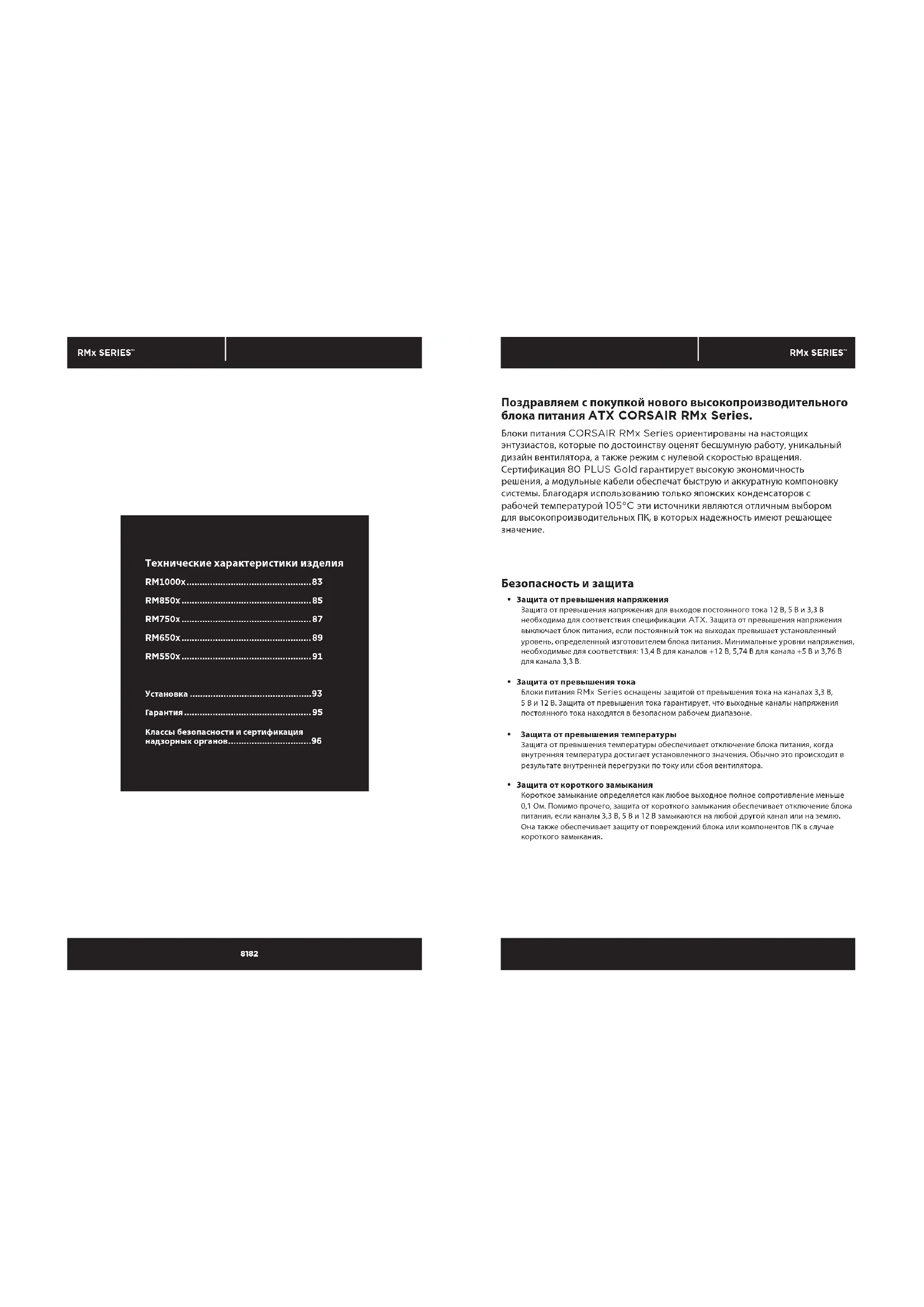- Защита от короткого замыкания Короткое замыкание определяется как любое выходное полное сопротивление меньше 0,1 Ом. Помимо прочего, защита от короткого замыкания обеспечивает отключение блока питания, если каналы 3,3 В, 5 В и 12 В замыкаются на любой другой канал или на землю. Она также обеспечивает защиту от повреждений блока или компонентов ПК в случае короткого замыкания. Технические характеристики изделия RM1000x ................................................ 83 RM850x .................................................. 85 RM750x .................................................. 87 RM650x .................................................. 89 RM550x .................................................. 91 Установка ...............................................93 Гарантия ................................................. 95 Классы безопасности и сертификация надзорных органов ................................9683 84 RMx SERIES