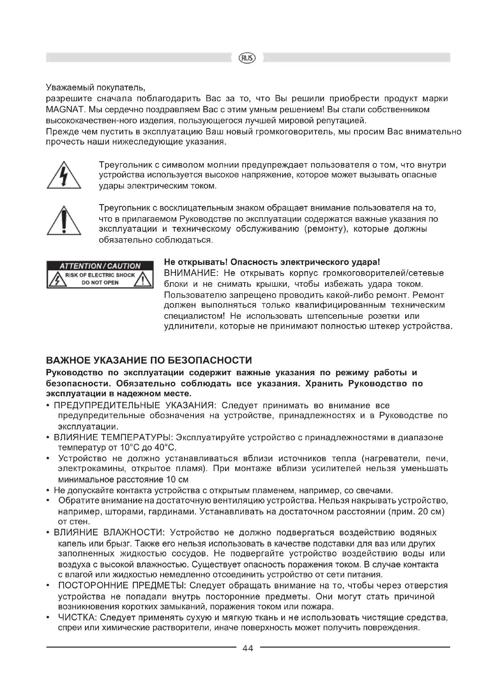 - Если устройство неправильно функционирует, хотя соблюдены все указания Руководства по эксплуатации. Допустимо предпринимать только те дополнительные изменения, которые разрешены изготовителем. Для ремонта необходимо использовать только оригинальные запасные детали. После ремонта необходимо проверить устройство на безопасность, чтобы обеспечить надлежащее и надежное функционирование. Ремонтные работы должны всегда выполняться квалифицированными специалистами, так как иначе может возникнуть опасное высокое напряжение или другие виды опасности. УКАЗАНИЯ ПО УТИЛИЗАЦИИ Согласно европейской директиве 2012/19/EU все электрические и электронные приборы для утилизации должны сдаваться отдельно в местные сборные пункты. Пожалуйста, выполняйте местные предписания и не выбрасывайте старые устройства вместе с обычным домашним мусором.46 ОБЩИЕ УКАЗАНИЯ ПО ПОДКЛЮЧЕНИЮ ВАШИХ САТЕЛЛИТНЫХ ГРОМКОГОВОРИТЕЛЕЙ МАРКИ MAGNAT Присоединительные клеммы громкоговорителей находятся на задней стороне этих громкоговорителей и оснащены зажимным приспособлением, которое подходит для закрепления кабелей с поперечным сечением медных жил до 1 мм². Для подключения боковых динамиков используйте обычный кабель для динамиков с сечением медных жил 2 х 0.75 мм