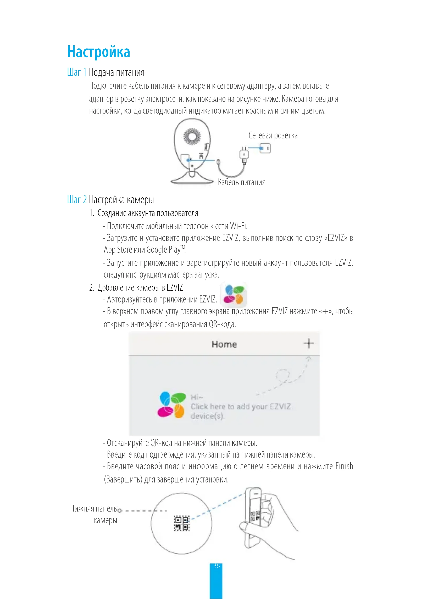- Авторизуйтесь в приложении EZVIZ. - В верхнем правом углу главного экрана приложения EZVIZ нажмите «+», чтобы открыть интерфейс сканирования QR-кода. - Отсканируйте QR-код на нижней панели камеры. - Введите код подтверждения, указанный на нижней панели камеры. - Введите часовой пояс и информацию о летнем времени и нажмите Finish (Завершить) для завершения установки. Кабель питания Сетевая розетка Нижняя панель камеры37
