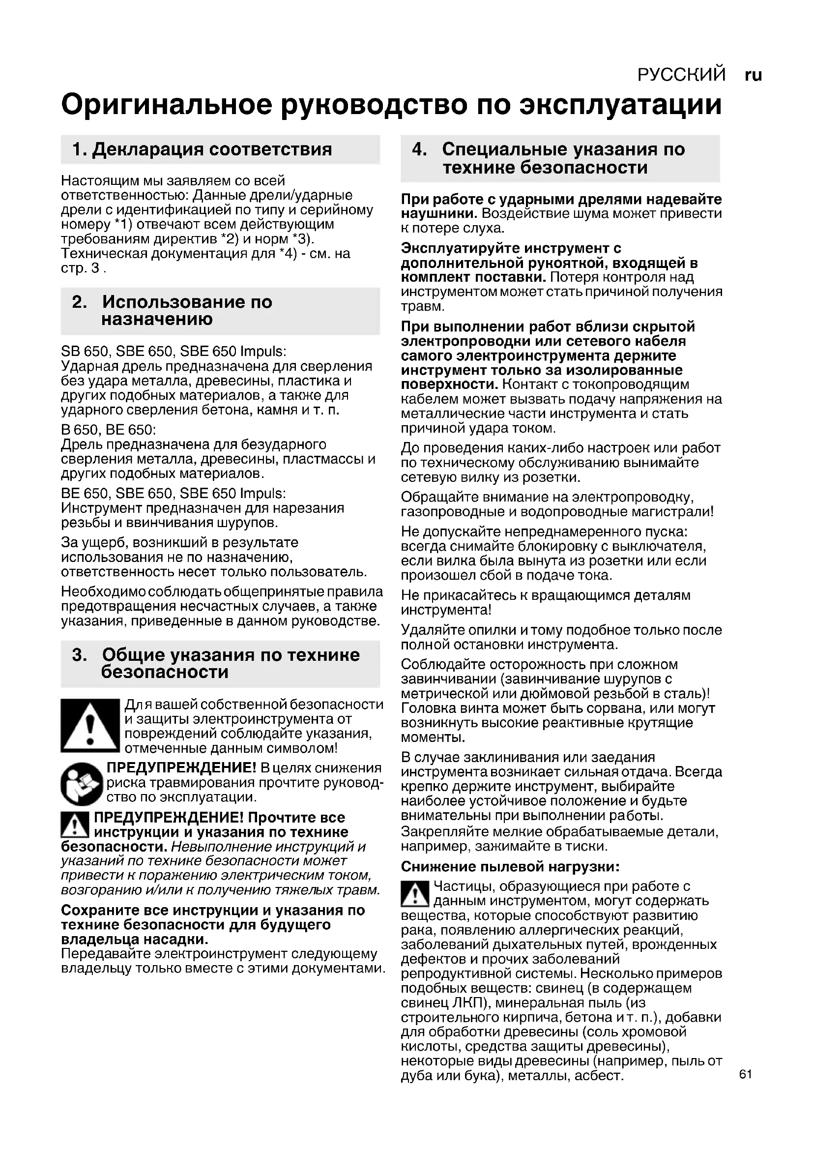 ель предназначена для безударного сверления металла, древесины, пластмассы и других подобных материалов. BE 650, SBE 650, SBE 650 Impuls: Инструмент предназначен для нарезания резьбы и ввинчивания шурупов. За ущерб, возникший в результате использования не по назначению, ответственность несет только пользователь. Необходимо соблюдать общепринятые правила предотвращения несчастных случаев, а также указания, приведенные в данном ру