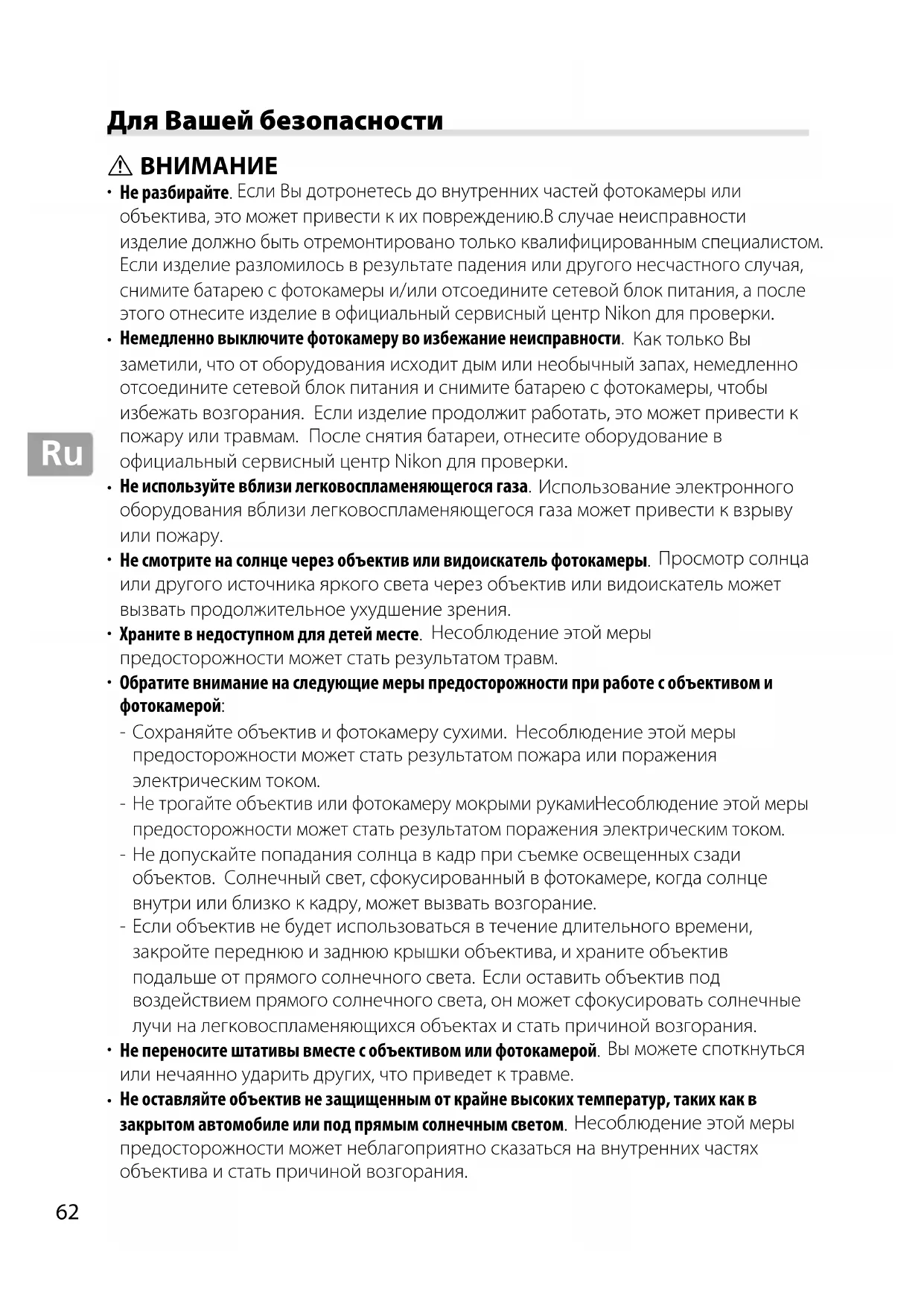 Не разбирайте. Если Вы дотронетесь до внутренних частей фотокамеры или объектива, это может привести к их повреждению. В случае неисправности изделие должно быть отремонтировано только квалифицированным специалистом. Если изделие разломилось в результате падения или другого несчастного случая, снимите батарею с фотокамеры и/или отсоедините сетевой блок питания, а после этого отнесите изделие в официальный сервисный центр Nikon для проверки. Немедленно выключите фотокамеру во избежание неисправности. Как только Вы заметили, что от оборудования исходит дым или необычный запах, немедленно отсоедините сетевой блок питания и снимите батарею с фотокамеры, чтобы избежать возгорания. Если изделие продолжит работать, это может привести к пожару или травмам. После снятия батареи, отнесите оборудование в официальный сервисный центр Nikon для проверки. Не используйте вблизи легковоспламеняющегося газа. Использование электронного оборудования вблизи легковоспламеняющегося газа может привести к взрыву или пожару. Не смотрите на солнце через объектив или видоискатель фотокамеры. Просмотр солнца или другого источника яркого света через объектив или видоискатель может вызвать продолжительное ухудшение зрения. Храните в недоступном для детей месте. Несоблюдение этой меры предосторожности может стать результатом травм. Обратите внимание на следующие меры предосторожности при работе с объективом и фотокамерой: Сохраняйте объектив и фотокамеру сухими. Несоблюдение этой меры предосторожности может стать результатом пожара или поражения электрическим током. Не трогайте объектив или фотокамеру мокрыми руками. Несоблюдение этой меры предосторожности может стать результатом поражения электрическим током. Не допускайте попадания солнца в кадр при съемке освещенных сзади