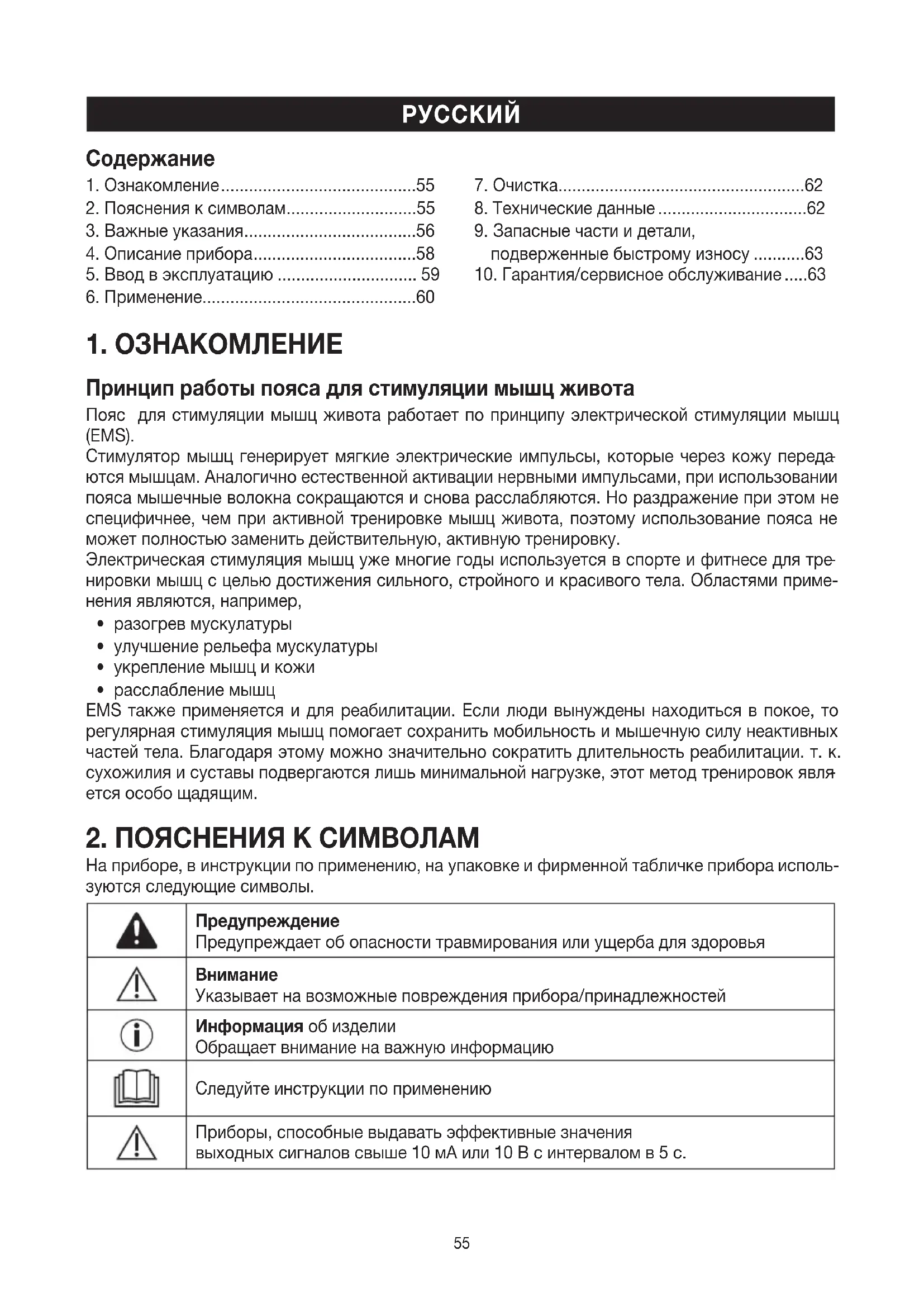 чит акустический сигнал, и на дисплее появляется пиктограмма « ». Для отмены блокировки кнопок повторно нажмите кнопку. Реагирование на неприятные ощущения Если Вы чувствуете покалывание или зуд или даже просто замечаете неприятные ощущения в точке сокращения мышц, рекомендуется выключить прибор и поступить следующим образом: