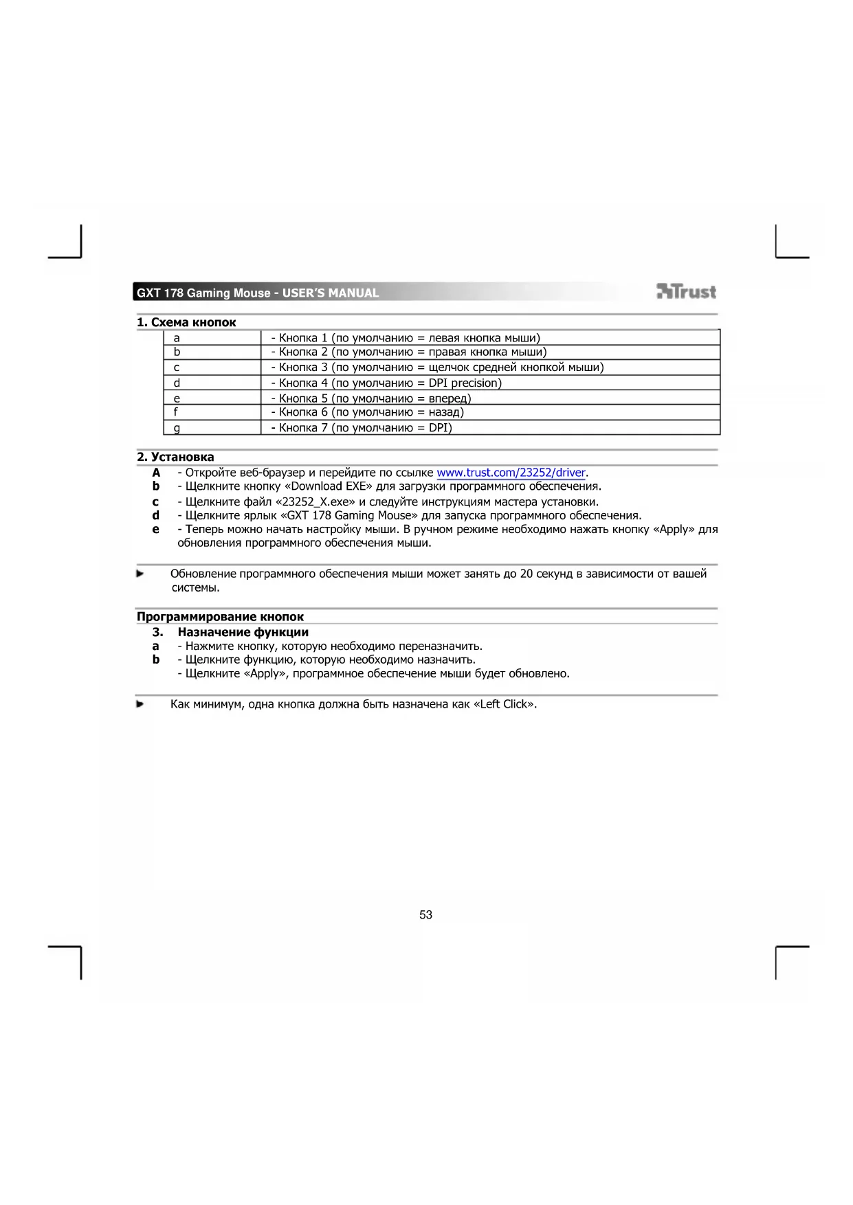 Если возникшую проблему не удалось решить, обратитесь в службу технической поддержки www.trust.com/23252/faq.GXT 178 Gaming Mouse - USER’S MANUAL