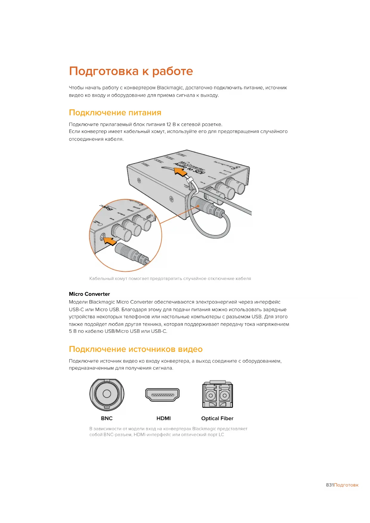 SDI IN POWER +12V SDI to Analog Кабельный хомут помогает предотвратить случайное отключение кабеля Micro Converter Модели Blackmagic Micro Converter обеспечиваются электроэнергией через интерфейс USB-C или Micro USB. Благодаря этому для подачи питания можно использовать зарядные устройства некоторых телефонов или настольные компьютеры с разъемом USB. Для этого также подойдет любая другая техника, которая поддерживает передачу тока напряжением 5 В по кабелю USB/Micro USB или USB-C. Подключение источников видео Подключите источник видео ко входу конвертера, а выход соедините с оборудованием, предназначенным для получения сигнала. BNC HDMI Optical Fiber В зависимости от модели вход на конвертерах Blackmagic представляет собой BNC-разъем, HDMI-интерфейс или оптический порт LC 831Подготовка к работеОптический интерфейс Некоторые конвертеры Blackmagic имеют специальное гнездо для установки оптического SFP-модуля по стандарту SMPTE с поддержкой 3G-, 6G- или 12G-SDI. Этот модуль представляет собой устройство приема и передачи сигнала с интерфейсом для подключения оптоволоконного кабеля.
