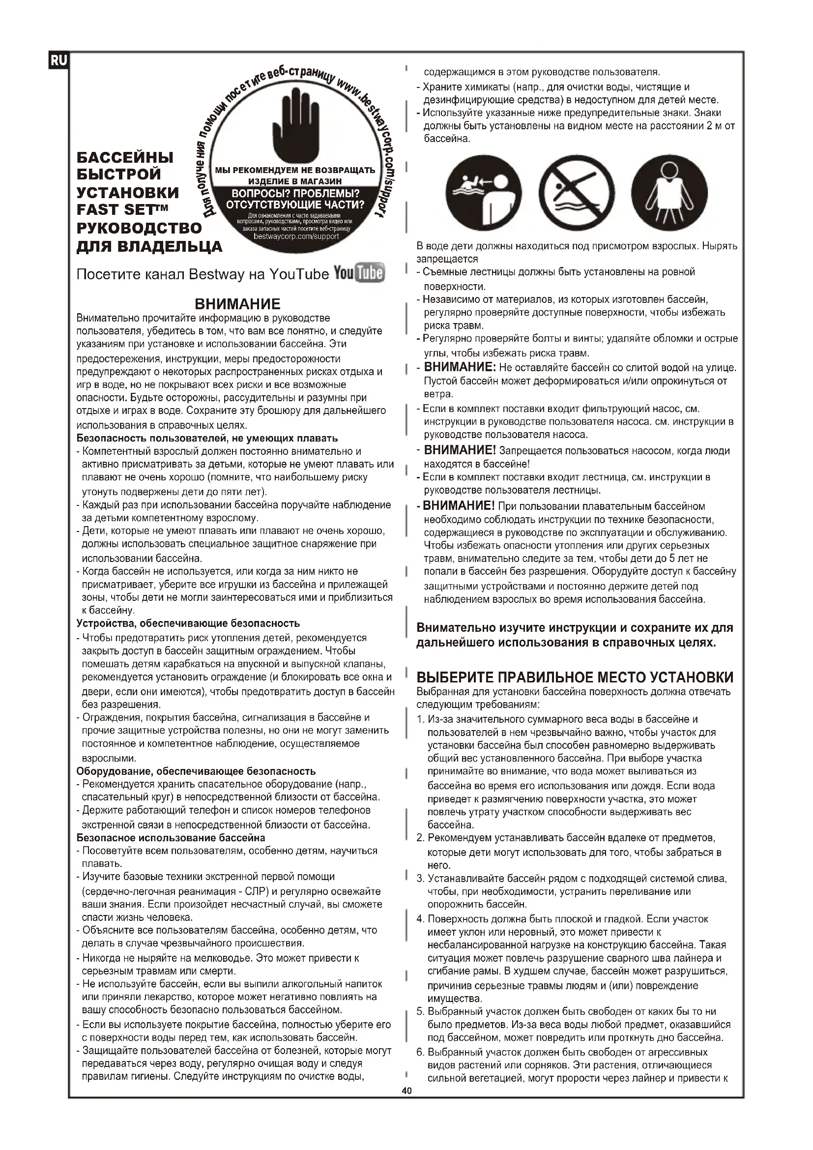 РУКОВОДСТВО ДЛЯ ВЛАДЕЛЬЦА Посетите канал Bestway на YouTube МЫ РЕКОМЕНДУЕМ НЕ ВОЗВРАЩАТЬИЗДЕЛИЕ В МАГАЗИНВОПРОСЫ? ПРОБЛЕМЫ?ОТСУТСТВУЮЩИЕ ЧАСТИ? Для ознакомления с часто задаваемыми вопросами, руководствами, просмотра видео или заказа запасных частей посетите веб-страницу bestwaycorp.com/support