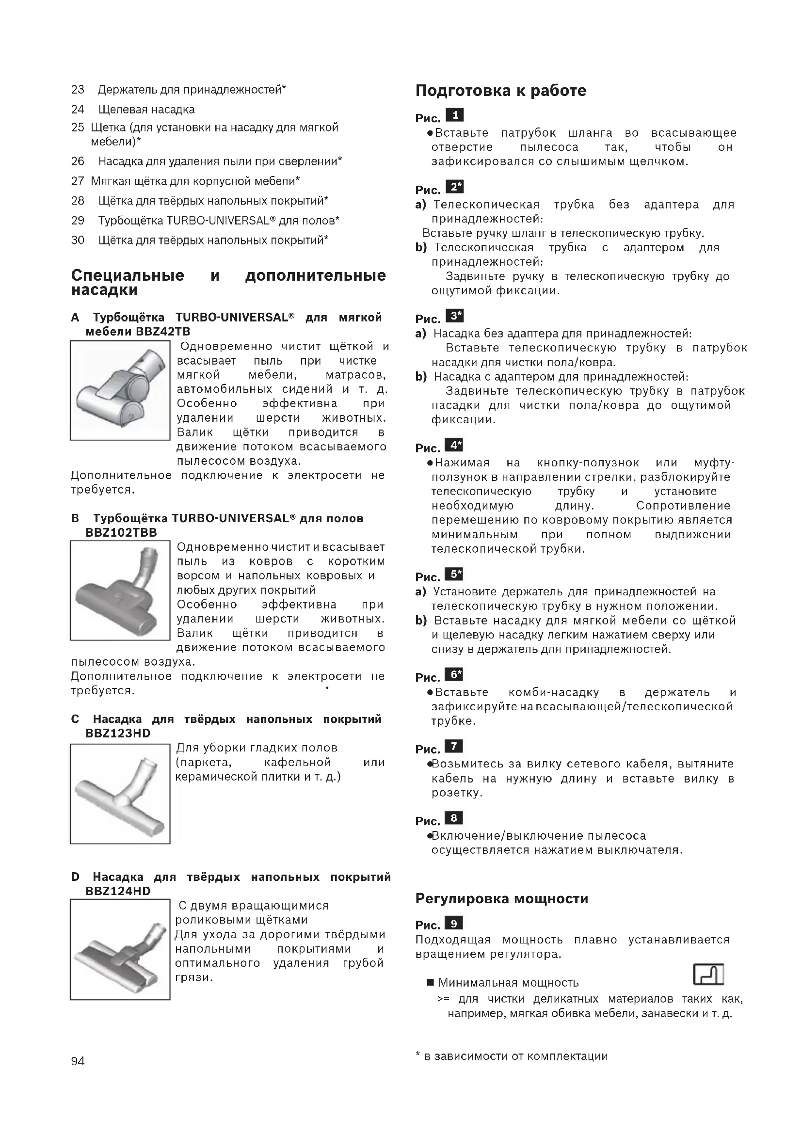 - в зависимости от комплектации94 23 Держатель для принадлежностей* 24 Щелевая насадка 25 Щетка (для установки на насадку для мягкой
