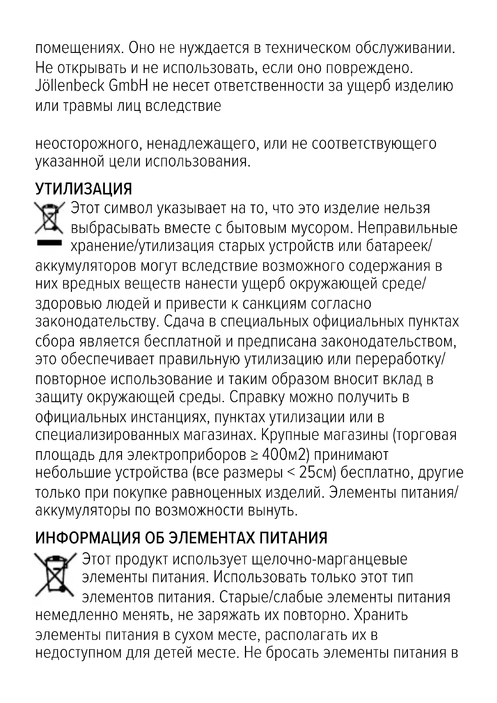 ИСПОЛЬЗОВАНИЕ ПО НАЗНАЧЕНИЮ Это изделие предназначено только для использования в качестве устройства для ввода для подключения к компьютеру дома или в офисе в сухих, закрытыхпомещениях. Оно не нуждается в техническом обслуживании. Не открывать и не использовать, если оно повреждено. Jöllenbeck GmbH не несет ответственности за ущерб изделию или травмы лиц вследствие неосторожного, ненадлежащего, или не соответствующего указанной цели использования.