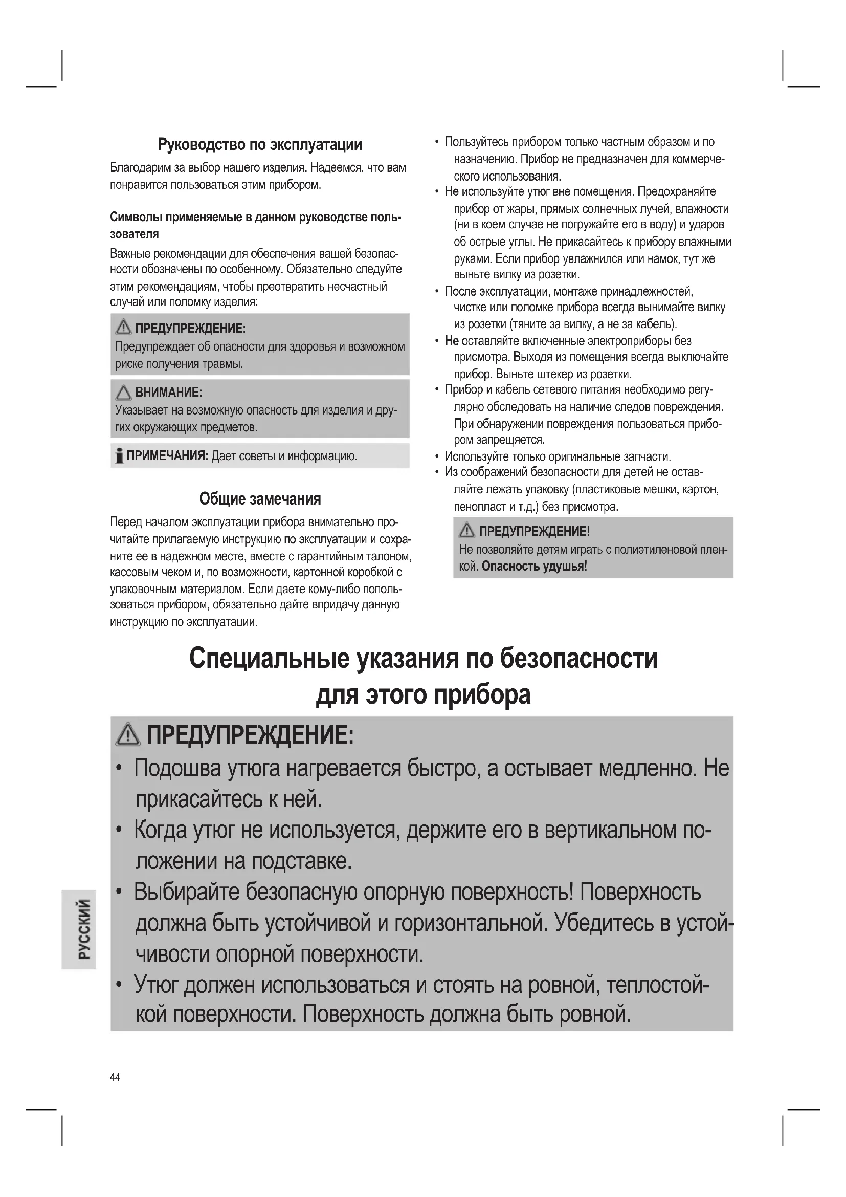- Утюг должен использоваться и стоять на ровной, теплостой- кой поверхности. Поверхность должна быть ровной.45 ПРЕДУПРЕЖДЕНИЕ: