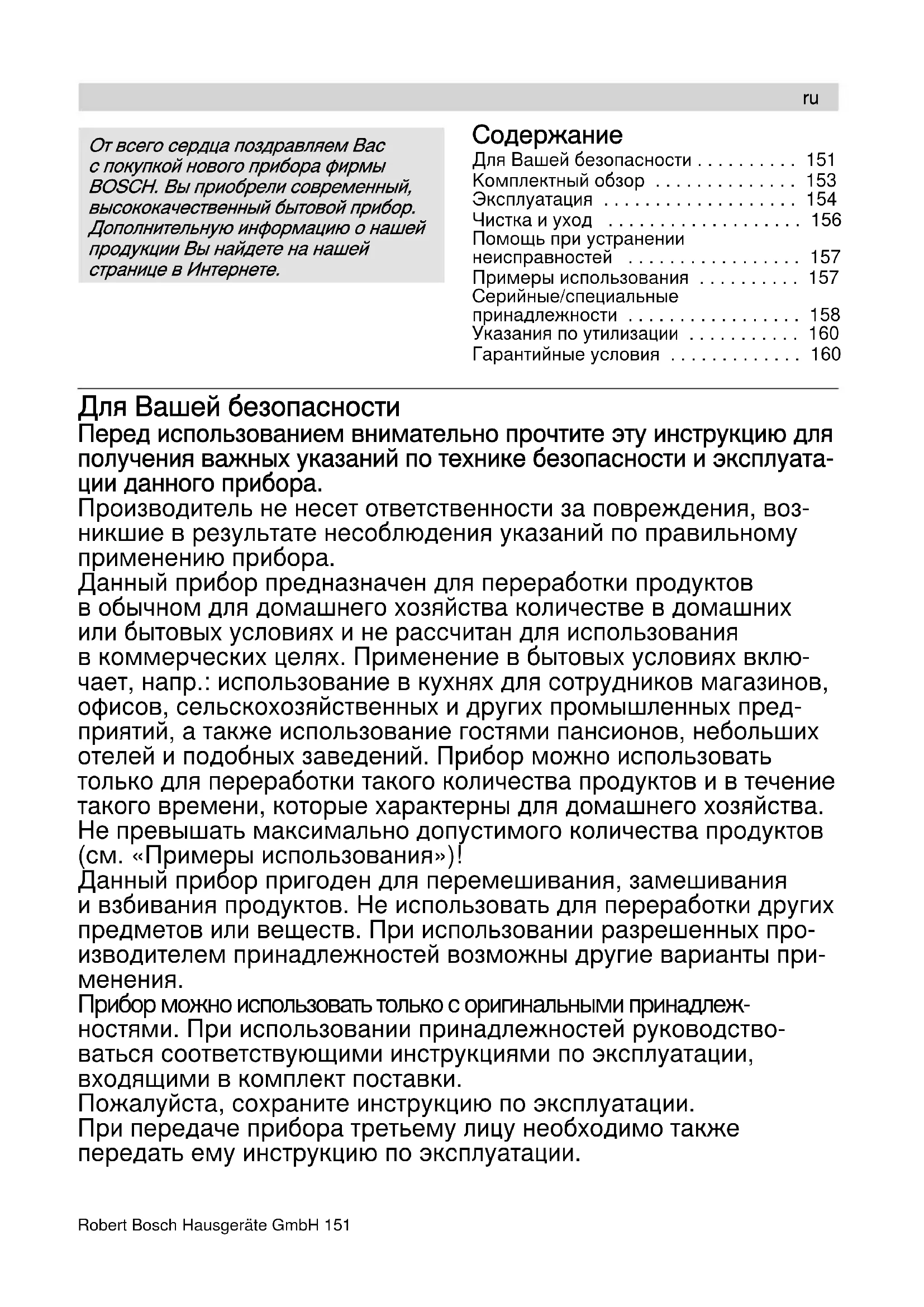 - Гарантийные условия Для Вашей безопасности Перед использованием внимательно прочтите эту инструкцию для получения важных указаний по технике безопасности и эксплуата- ции данного прибора. Производитель не несет ответственности за повреждения, воз- никшие в результате несоблюдения указаний по правильному применению прибора. Данный прибор предназначен для переработки продуктов в обычном для домашнего хозяйства количестве в домашних или бытовых условиях и не рассчитан для использования в коммерческих целях. Применение в бытовых условиях вклю- чает, напр.: использование в кухнях для сотрудников магазинов, офисов, сельскохозяйственных и других промышленных пред- приятий, а также использование гостями пансионов, небольших отелей и подобных заведений. Прибор можно использовать только для переработки такого количества продуктов и в течение такого времени, которые характерны для домашнего хозяйства. Не превышать максимально допустимого количества продуктов (см. «Примеры использования»)! Данный прибор пригоден для перемешивания, замешивания и взбивания продуктов. Hе использовать для переработки других предметов или веществ. При использовании разрешенных про- изводителем принадлежностей возможны другие варианты при- p. 160