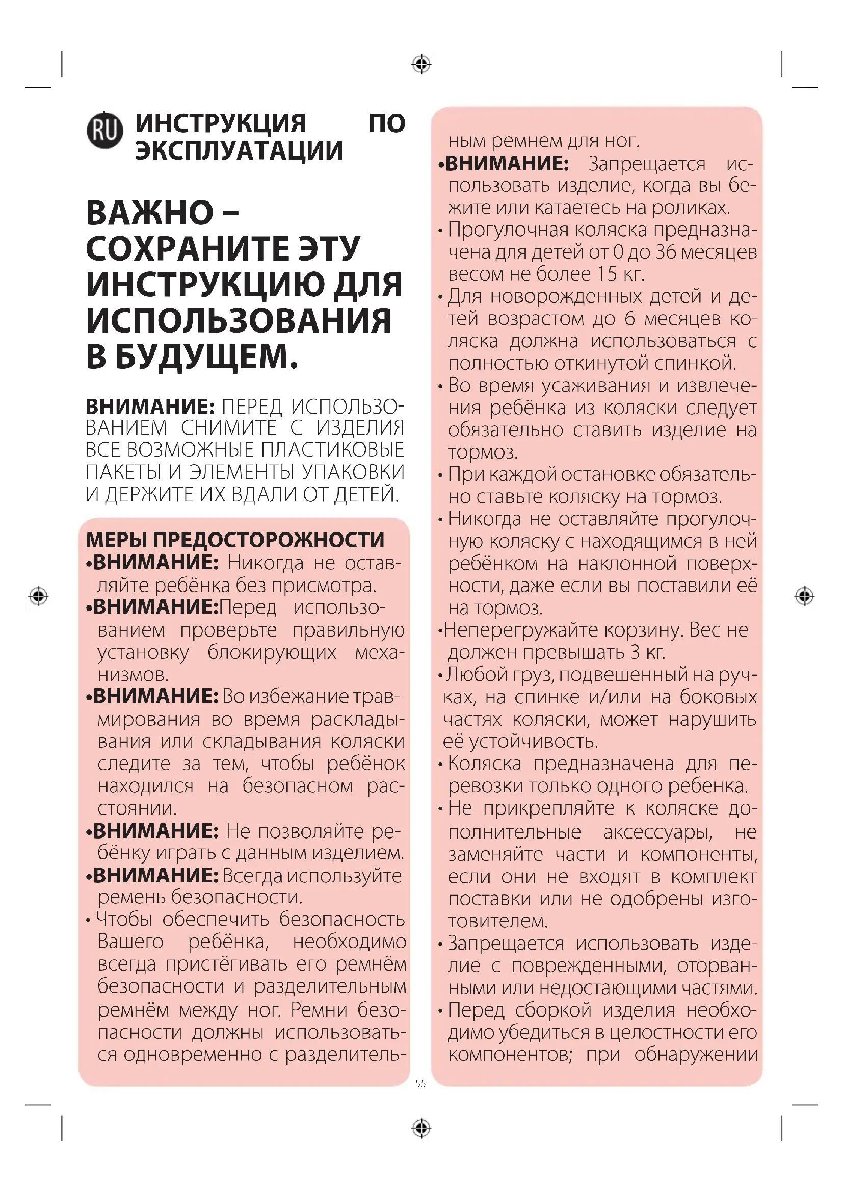 - Прогулочная коляска предназна- чена для детей от 0 до 36 месяцев весом не более 15 кг.