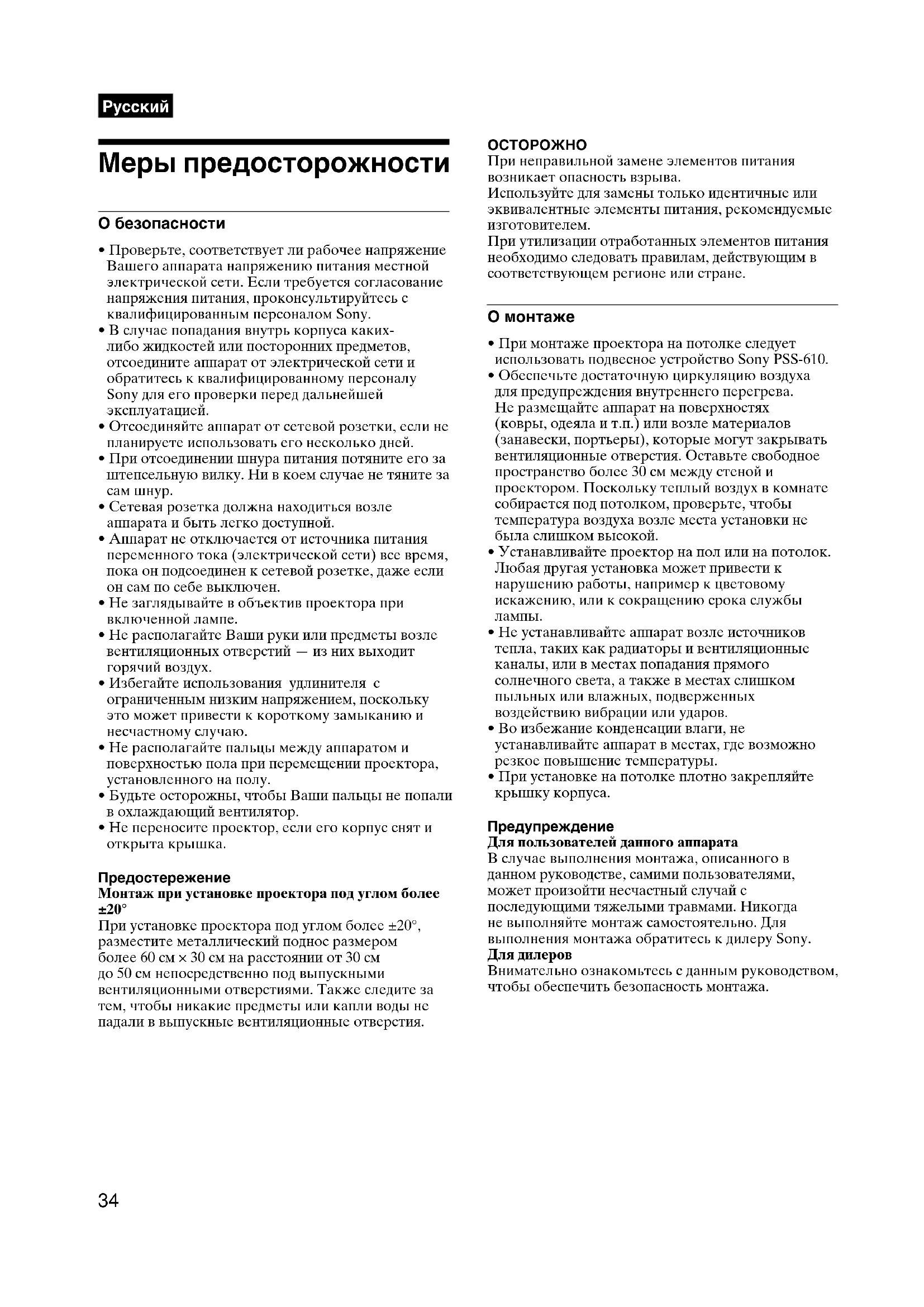 - При монтаже проектора на потолке следует использовать подвесное устройство Sony PSS-610.