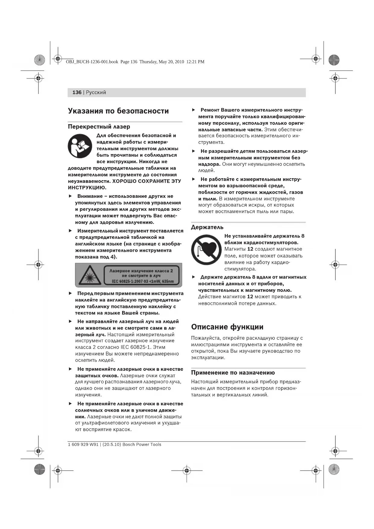Не устанавливайте держатель 8 вблизи кардиостимуляторов. Магниты 12 создают магнитное поле, которое может оказывать влияние на работу кардио- стимулятора. f Держите держатель 8 вдали от магнитных носителей данных и от приборов, чувствительных к магнитному полю. Действие магнитов 12 может приводить к невосполнимой потере данных. Описание функции Пожалуйста, откройте раскладную страницу с иллюстрациями инструмента и оставляйте ее открытой, пока Вы изучаете руководство по эксплуатации. Применение по назначению Настоящий измерительный прибор предназ- начен для построения и контроля горизон- тальных и вертикальных линий. OBJ_BUCH-1236-001.book Page 136 Thursday, May 20, 2010 12:21 PMРусский | 137 Bosch Power Tools 1 609 929 W91 | (20.5.10) Технические данные Изображенные составные части Нумерация представленных составных частей выполнена по изображению измерительного инструмента на странице с иллюстрациями. 1 Отверстие для выхода лазерного луча 2 Гнездо под штатив 1/4" 3 Выключатель 4 Предупредительная табличка лазерного