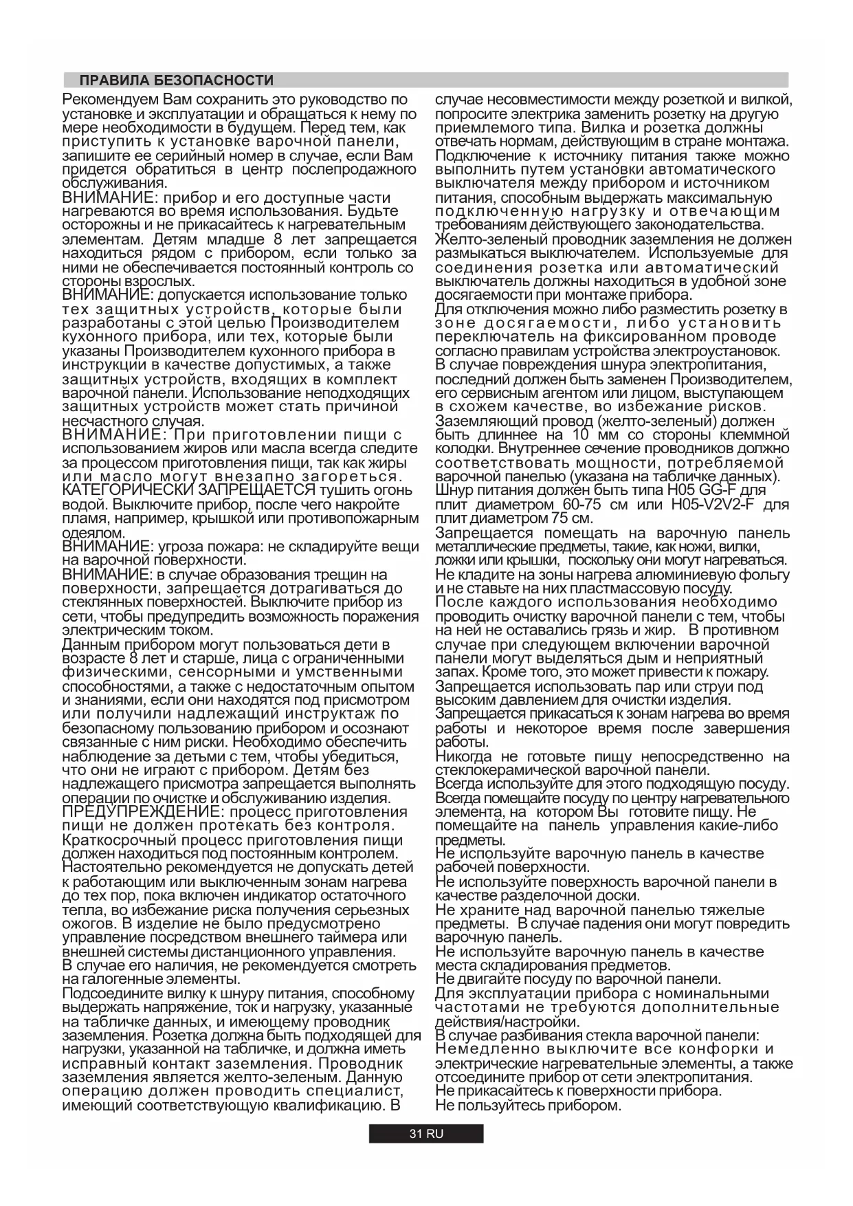 ВНИМАНИЕ: угроза пожара: не складируйте вещи на варочной поверхности. Данным прибором могут пользоваться дети в возрасте 8 лет и старше, лица с ограниченными физическими, сенсорными и умственными способностями, а также с недостаточным опытом и знаниями, если они находятся под присмотром или получили надлежащий инструктаж по безопасному пользованию прибором и осознают связанные с ним риски. Необходимо обеспечить наблюдение за детьми с тем, чтобы убедиться, что они не играют с прибором. Детям без надлежащего присмотра запрещается выполнять операции по очистке и обслуживанию изделия. ВНИМАНИЕ: прибор и его доступные части нагреваются во время использования. Будьте осторожны и не прикасайтесь к нагревательным элементам. Детям младше 8 лет запрещается находиться рядом с прибором, если только за ними не обеспечивается постоянный контроль со стороны взрослых. ПРЕДУПРЕЖДЕНИЕ: процесс приготовления пищи не должен протекать без контроля. Краткосрочный процесс приготовления пищи должен находиться под постоянным контролем. Настоятельно рекомендуется не допускать детей к работающим или выключенным зонам нагрева до тех пор, пока включен индикатор остаточного тепла, во избежание риска получения серьезных ожогов. В изделие не было предусмотрено управление посредством внешнего таймера или внешней системы дистанционного управления. В случае его наличия, не рекомендуется смотреть на галогенные элементы. Подсоедините вилку к шнуру питания, способному выдержать напряжение, ток и нагрузку, указанные на табличке данных, и имеющему проводник заземления. Розетка должна быть подходящей для нагрузки, указанной на табличке, и должна иметь исправный контакт заземления. Проводник заземления является желто-зеленым. Данную операцию должен проводить специалист, имеющий соответствующую квалификацию. В Рекомендуем Вам сохранить это руководство по установке и эксплуатации и обращаться к нему по мере необходимости в будущем. Перед тем, как приступить к установке варочной панели, запишите ее серийный номер в случае, если Вам придется обратиться в центр послепродажного обслуживания. ВНИМАНИЕ: в случае образования трещин на поверхности, запрещается дотрагиваться до стеклянных поверхностей. Выключите прибор из сети, чтобы предупредить возможность поражения электрическим током. ПРАВИЛА БЕЗОПАСНОСТИ случае несовместимости между розеткой и вилкой, попросите электрика заменить розетку на другую приемлемого типа. Вилка и розетка должны отвечать нормам, действующим в стране монтажа. Подключение к источнику питания также можно выполнить путем установки автоматического выключателя между прибором и источником питания, способным выдержать максимальную подключенную нагрузку и отвечающим требованиям действующего законодательства. Желто-зеленый проводник заземления не должен размыкаться выключателем. Используемые для соединения розетка или автоматический выключатель должны находиться в удобной зоне досягаемости при монтаже прибора. Для отключения можно либо разместить розетку в зоне досягаемости, либо установить переключатель на фиксированном проводе согласно правилам устройства электроустановок. В случае повреждения шнура электропитания, последний должен быть заменен Производителем, его сервисным агентом или лицом, выступающем 