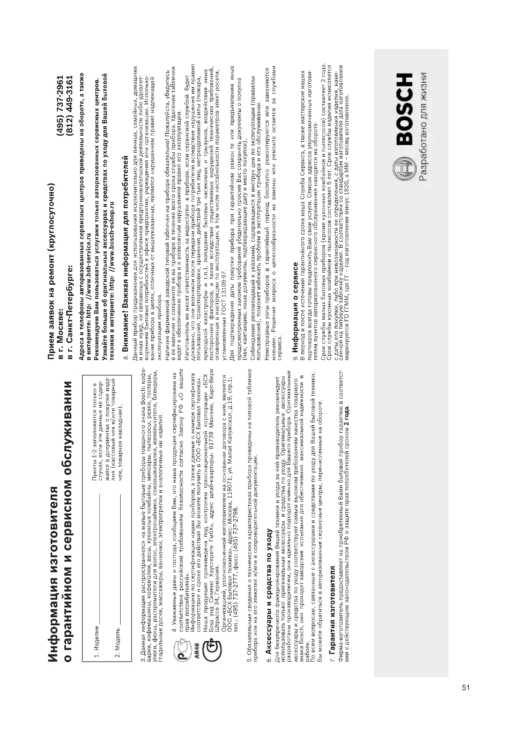 GA 9000 803 618_Turbo Zoo 11.07.2012 07:59 Seite 4849 GA 9000 803 618_Turbo Zoo 11.07.2012 07:59 Seite 4950 GA 9000 803 618_Turbo Zoo 11.07.2012 07:59 Seite 5051 Информация изготовителя о гарантийном и сервисном обслуживании Адреса и телефоны авторизованных сервисных центров приведены на обороте, а также в интернете: http: //www.bsh-service.ruРекомендуем Вам пользоваться услугами только авторизованных сервисных центров.Узнайте больше об оригинальных аксессуарах и средствах по уходу для Вашей бытовой техники в интернете: http: //www.bosch-eshop.ru1. Изделие __________________________________________________2. Модель __________________________________________________3. Данная информация распространяется на малые бытовые приборы товарного знака Bosch: кофе-варки, кофемашины, кофемолки, весы, кухонные комбайны, миксеры, пылесосы, резки, тостеры, утюги, фены, распрямители для волос, электрочайники, соковыжималки, измельчители, блендеры, гладильные доски, массажеры, ванночки, электрогрелки и аналогичные им изделия.4. Уважаемые дамы и господа, сообщаем Вам, что наша продукция сертифицирована на соответствие российским требованиям безопасности согласно Закону РФ «О защите прав потребителей».Информацию по сертификации наших приборов, а также данные о номере сертификата соответствия и сроке его действия Вы можете получить в ООО «БСХ Бытовая техника». Наша продукция произведена под контролем транснациональной корпорации «БСХ Бош унд Сименс Хаусгерете ГмбХ», адрес штаб-квартиры: 81739 Мюнхен, Карл-Вери Штрассе 34, Германия. Организацией, уполномоченной изготовителем на основании договора с ним, является ООО «БСХ Бытовая техника», адрес: Москва, 119071, ул. Малая Калужская, д.19, стр.1; тел.: (495) 737-2777, факс: (495) 737-2798.5. Обязательные сведения о технических характеристиках прибора приведены на типовой табличке прибора или на его этикетке и/или в сопроводительной документации. Аксессуары и средства по уходу Для безупречного функционирования Вашей техники и ухода за ней производитель рекомендует использовать только оригинальные аксессуары и средства по уходу. Оригинальные аксессуары разработаны производителем, они идеально подходят именно для Вашего прибора. Оригинальные аксессуары и средства по уходу соответствуют самым высоким требованиям качества товарного знака Bosch, они проходят заводские испытания для обеспечения максимальной надежности в работе.По всем вопросам, связанным с аксессуарами и средствами по уходу для Вашей бытовой техники, Вы можете обратиться в авторизованные сервисные центры, перечисленные на обороте. Гарантия изготовителяФирма-изготовитель предоставляет на приобретенный Вами бытовой прибор гарантию в соответст-вии с действующим законодательством РФ о защите прав потребителей сроком 2 года.Пункты 1-2 заполняются только в случае, если эти данные не содер-жатся в документах о покупке изде-лия (кассовый чек и/или товарный чек, товарная накладная).8. Внимание! Важная информация для потребителейДанный прибор предназначен для использования исключительно для личных, семейных, домашних и иных нужд, не связанных с осуществлением предпринимательской деятельности либо удовлет-ворением бытовых потребностей в офисе предприятия, учреждения или организации. Использо-вание прибора в целях, отличных от вышеуказанных, является нарушением правил надлежащей эксплуатации прибора.Наличие фирменной заводской типовой таблички на приборе обязательно! Пожалуйста, убедите