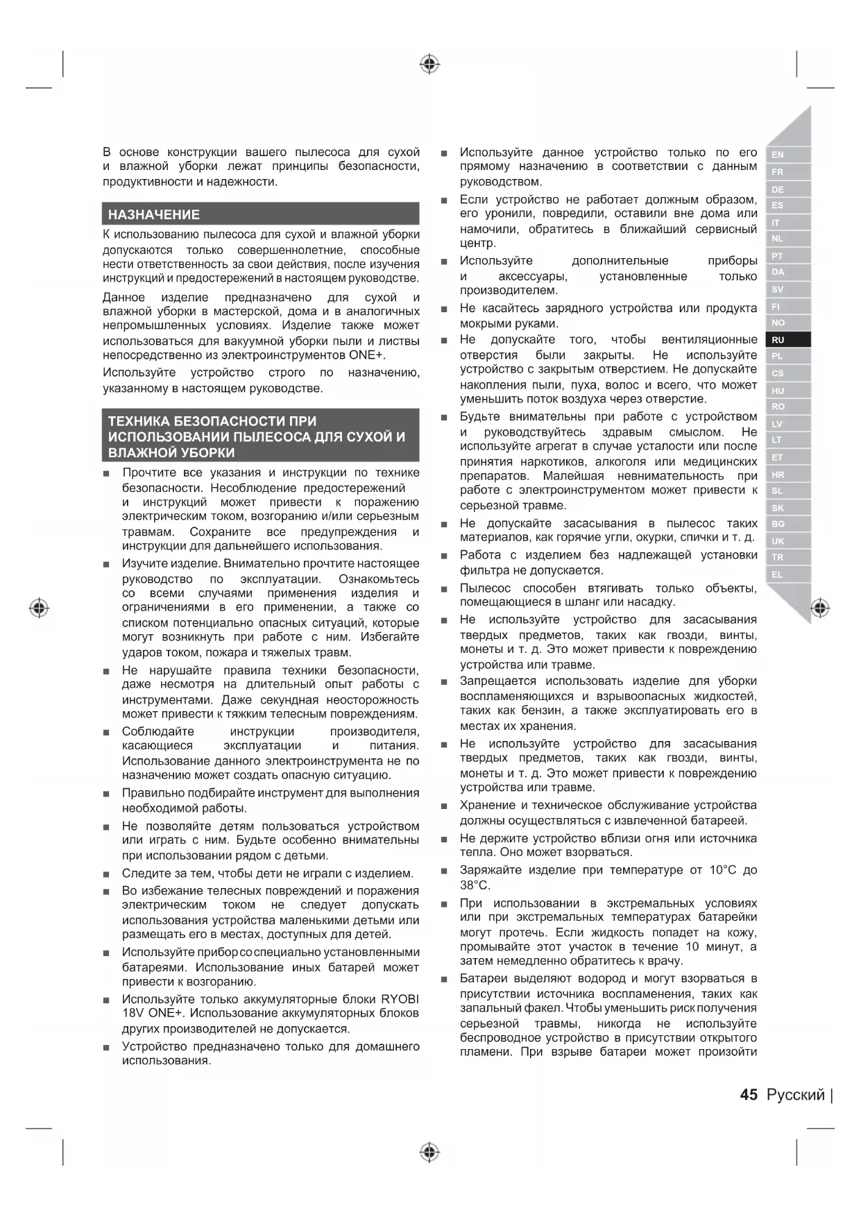 К использованию пылесоса для сухой и влажной уборки допускаются только совершеннолетние, способные нести ответственность за свои действия, после изучения инструкций и предостережений в настоящем руководстве. Данное изделие предназначено для сухой и влажной уборки в мастерской, дома и в аналогичных непромышленных условиях. Изделие также может использоваться для вакуумной уборки пыли и листвы непосредственно из электроинструментов ONE+. Используйте устройство строго по назначению, указанному в настоящем руководстве. ТЕХНИКА БЕЗОПАСНОСТИ ПРИ ИСПОЛЬЗОВАНИИ ПЫЛЕСОСА ДЛЯ СУХОЙ И ВЛАЖНОЙ УБОРКИ ■ Прочтите все указания и инструкции по технике безопасности. Несоблюдение предостережений и инструкций может привести к поражению электрическим током, возгоранию и/или серьезным травмам. Сохраните все предупреждения и инструкции для дальнейшего использования. ■ Изучите изделие. Внимательно прочтите настоящее руководство по эксплуатации. Ознакомьтесь со всеми случаями применения изделия и ограничениями в его применении, а также со списком потенциально опасных ситуаций, которые могут возникнуть при работе с ним. Избегайте ударов током, пожара и тяжелых травм. ■ Не нарушайте правила техники безопасности, даже несмотря на длительный опыт работы с инструментами. Даже секундная неосторожность может привести к тяжким телесным повреждениям. ■ Соблюдайте инструкции производителя, касающиеся эксплуатации и питания. Использование данного электроинструмента не по назначению может создать опасную ситуацию. ■ Правильно подбирайте инструмент для выполнения необходимой работы. ■ Не позволяйте детям пользоваться устройством или играть с ним. Будьте особенно внимательны при использовании рядом с детьми. ■ Следите за тем, чтобы дети не играли с изделием. ■ Во избежание телесных повреждений и поражения электрическим током не следует допускать использования устройства маленькими детьми или размещать его в местах, доступных для детей. ■ Используйте прибор со специально установленными батареями. Использование иных батарей может привести к возгоранию. ■ Используйте только аккумуляторные блоки RYOBI 18V ONE+. Использование аккумуляторных блоков других производителей не допускается. ■ Устройство предназначено только для домашнего использования. ■ Используйте данное устройство только по его прямому назначению в соответствии с данным руководством. ■ Если устройство не работает должным образом, его уронили, повредили, оставили вне дома или намочили, обратитесь в ближайший сервисный