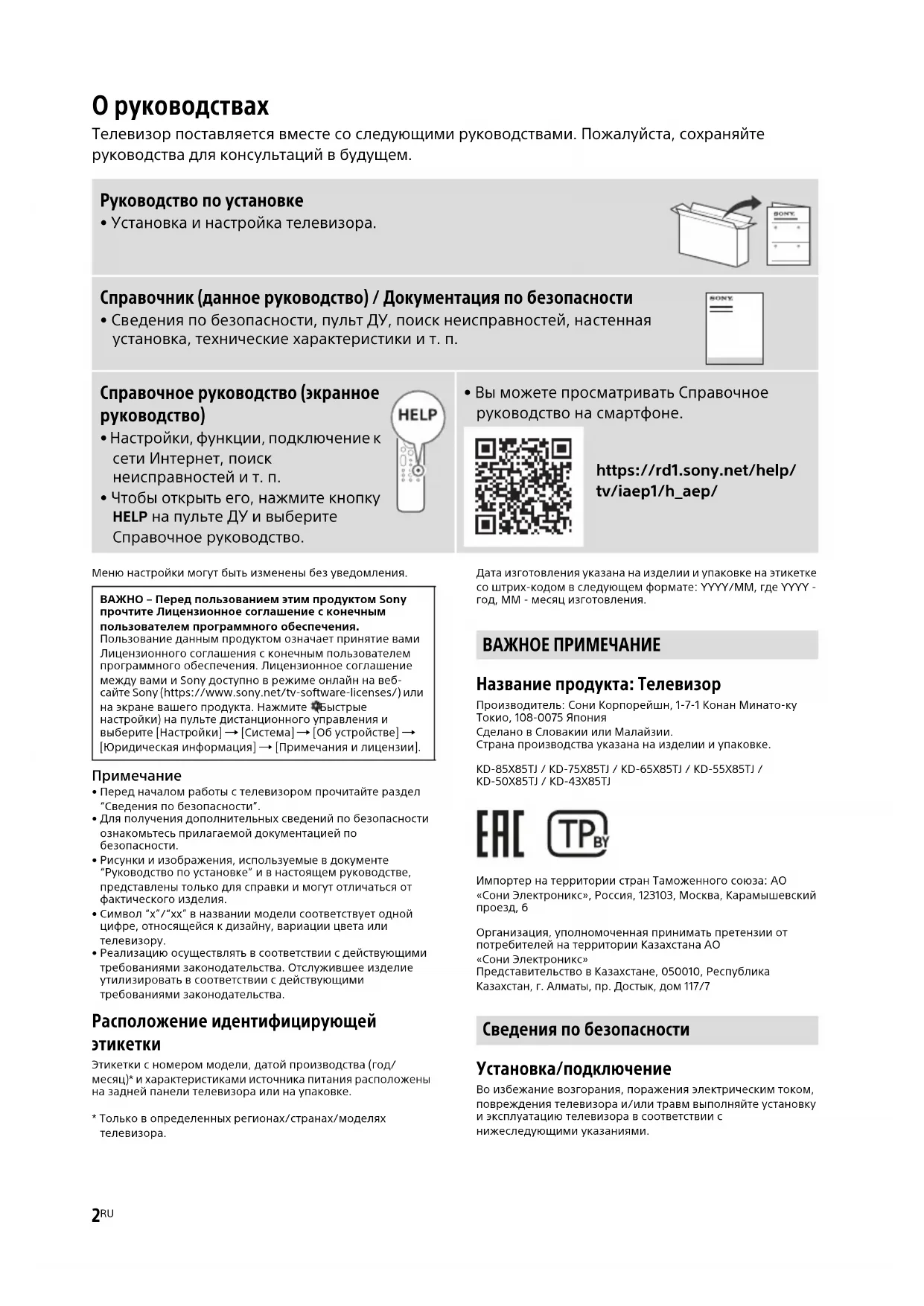 - Только в определенных регионах/странах/моделях телевизора. Дата изготовления указана на изделии и упаковке на этикетке со штрих-кодом в следующем формате: YYYY/MM, где YYYY - год, MM - месяц изготовления. Название продукта: Телевизор Производитель: Сони Корпорейшн, 1-7-1 Конан Минато-ку Токио, 108-0075 Япония Сделано в Словакии или Малайзии. Страна производства указана на изделии и упаковке. KD-85X85TJ / KD-75X85TJ / KD-65X85TJ / KD-55X85TJ / KD-50X85TJ / KD-43X85TJ Импортер на территории стран Таможенного союза: АО «Сони Электроникс», Россия, 123103, Москва, Карамышевский проезд, 6 Организация, уполномоченная принимать претензии от потребителей на территории Казахстана АО «Сони Электроникс» Представительство в Казахстане, 050010, Республика Казахстан, г. Алматы, пр. Достык, дом 117/7 Установка/подключение Во избежание возгорания, поражения электрическим током, повреждения телевизора и/или травм выполняйте установку и эксплуатацию телевизора в соответствии с нижеследующими указаниями. Руководство по установке