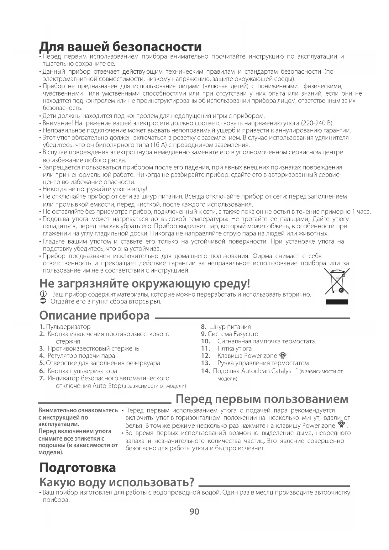 - Этот утюг обязательно должен включаться в розетку с заземлением. В случае использования удлинителя убедитесь, что он биполярного типа (16 А) с проводником заземления.