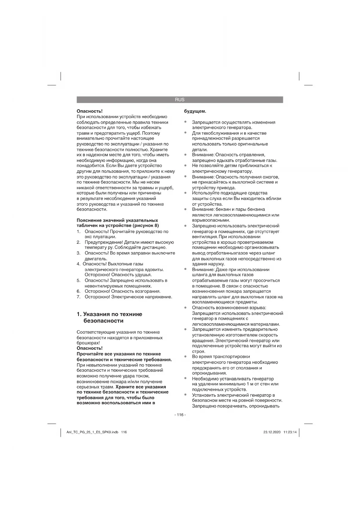 Установить электрический генератор в безопасном месте на ровной поверхности. Запрещено поворачивать, опрокидывать Anl_TC_PG_25_1_E5_SPK9.indb 116Anl_TC_PG_25_1_E5_SPK9.indb 116 23.12.2020 11:23:1423.12.2020 11:23:14RUS