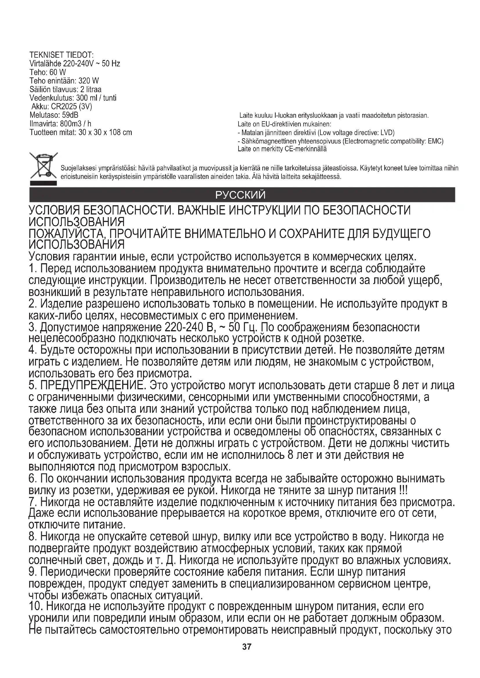 уронили или повредили иным образом, или если он не работает должным образом. Не пытайтесь самостоятельно отремонтировать неисправный продукт, поскольку это TEKNISET TIEDOT: Virtalähde 220-240V ~ 50 Hz Teho: 60 W Teho enintään: 320 W Säiliön tilavuus: 2 litraa Vedenkulutus: 300 ml / tunti Akku: CR2025 (3V) Melutaso: 59dB Ilmavirta: 800m3 / h Tuotteen mitat: 30 x 30 x 108 cm38 может привести к поражению электрическим током. Всегда отправляйте поврежденное устройство в специализированный сервисный центр для его ремонта. Ремонт может быть выполнен только авторизованными специалистами сервисной службы. Неправильно выполненный ремонт может создать опасные ситуации для пользователя.