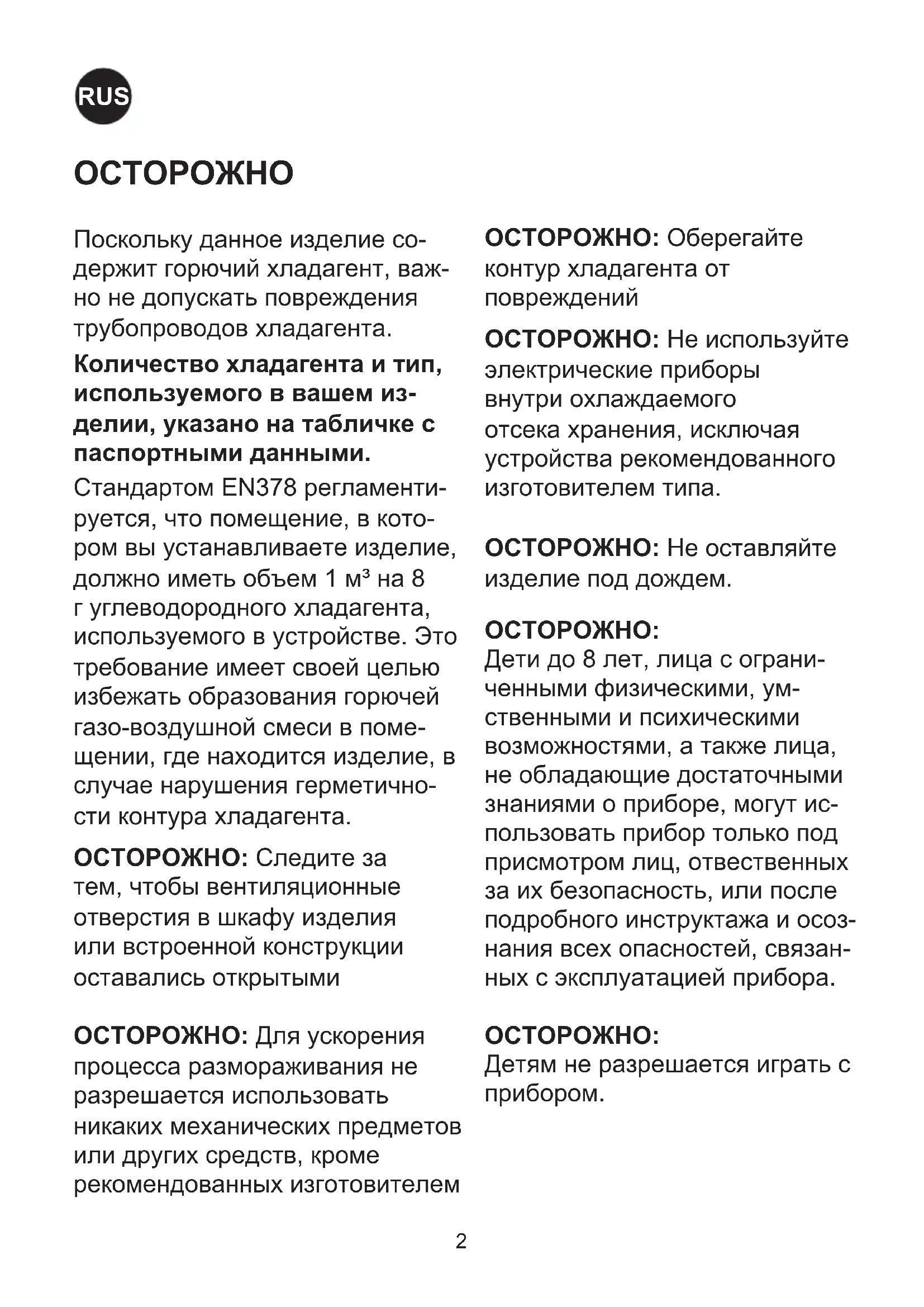 ESОСТОРОЖНО Поскольку данное изделие со- держит горючий хладагент, важ- но не допускать повреждения трубопроводов хладагента. Количествохладагентаитип, используемоговвашемиз- делии,указанонатабличкес паспортнымиданными. Стандартом EN378 регламенти- руется, что помещение, в кото- ром вы устанавливаете изделие, должно иметь объем 1 м³ на 8 г углеводородного хладагента, используемого в устройстве. Это требование имеет своей целью избежать образования горючей газо-воздушной смеси в поме- щении, где находится изделие, в случае нарушения герметично- сти контура хладагента. ОСТОРОЖНО:Следите за тем, чтобы вентиляционные отверстия в шкафу изделия или встроенной конструкции оставались открытыми ОСТОРОЖНО:Для ускорения процесса размораживания не разрешается использовать никаких механических предметов или других средств, кроме рекомендованных изготовителем ОСТОРОЖНО: Оберегайте контур хладагента от повреждений ОСТОРОЖНО:Не используйте электрические приборы внутри охлаждаемого отсека хранения, исключая устройства рекомендованного изготовителем типа. ОСТОРОЖНО:Не оставляйте изделие под дождем.