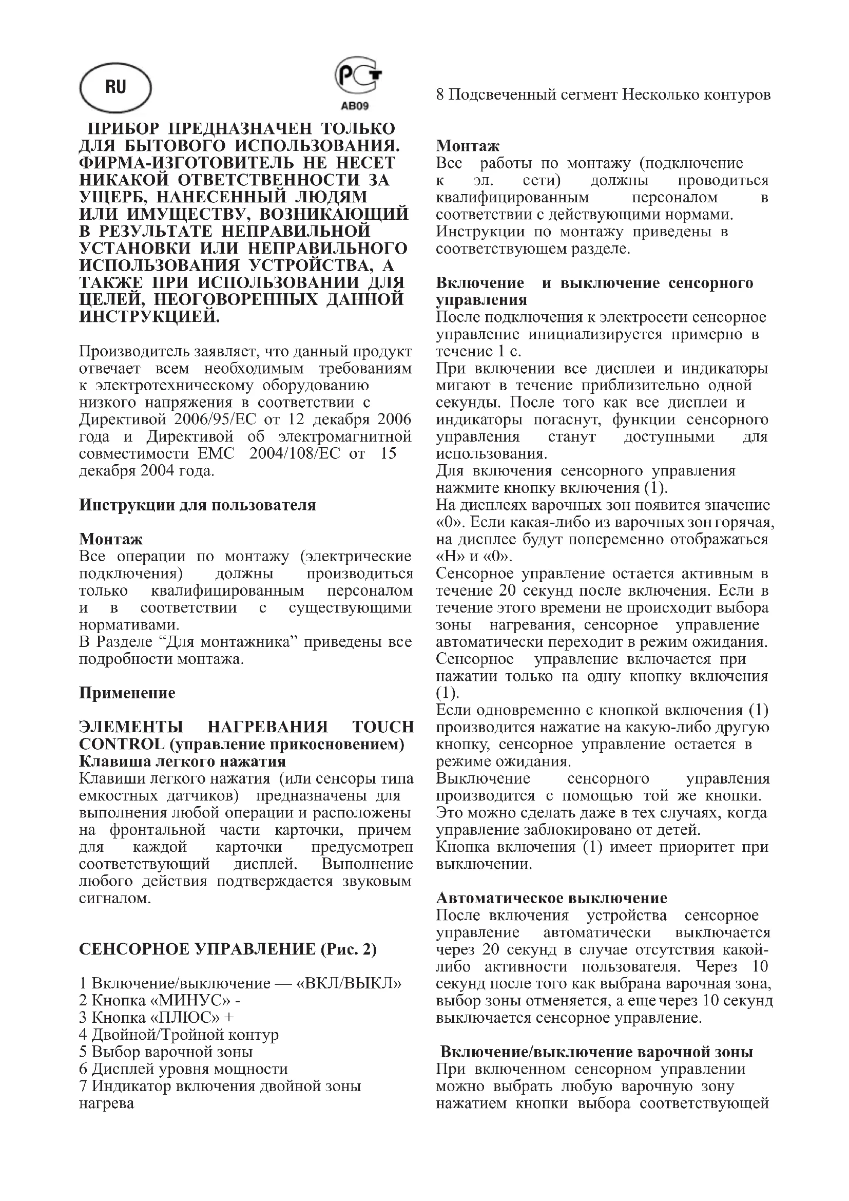 СЕНСОРНОЕ УПРАВЛЕНИЕ (Рис. 2) 1 Включение/выключение — «ВКЛ/ВЫКЛ» 2 Кнопка «МИНУС» - 3 Кнопка «ПЛЮС» + 4 Двойной/Тройной контур 5 Выбор варочной зоны 6 Дисплей уровня мощности 7 Индикатор включения двойной зоны