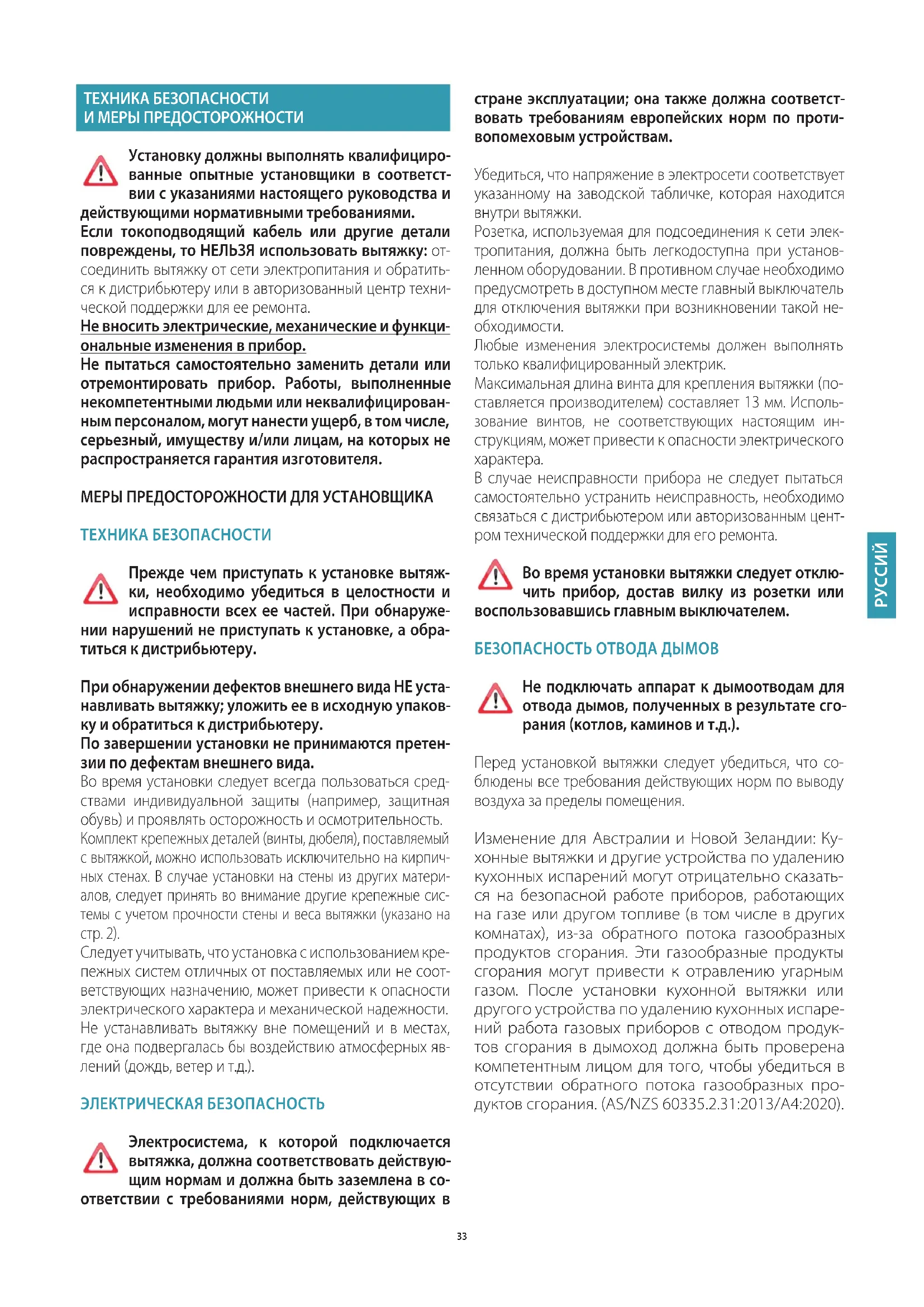 В случае неисправности прибора не следует пытаться самостоятельно устранить неисправность, необходимо связаться с дистрибьютером или авторизованным цент- ром технической поддержки для его ремонта. Во время установки вытяжки следует отклю- чить прибор, достав вилку из розетки или воспользовавшись главным выключателем. БЕЗОПАСНОСТЬ ОТВОДА ДЫМОВ Не подключать аппарат к дымоотводам для отвода дымов, полученных в результате сго- рания (котлов, каминов и т.д.). Перед установкой вытяжки следует убедиться, что со- блюдены все требования действующих норм по выводу воздуха за пределы помещения. Изменение для Австралии и Новой Зеландии: Ку- хонные вытяжки и другие устройства по удалению кухонных испарений могут отрицательно сказать- ся на безопасной работе приборов, работающих на газе или другом топливе (в том числе в других комнатах), из-за обратного потока газообразных продуктов сгорания. Эти газообразные продукты сгорания могут привести к отравлению угарным газом. После установки кухонной вытяжки или другого устройства по удалению кухонных испаре- ний работа газовых приборов с отводом продук- тов сгорания в дымоход должна быть проверена компетентным лицом для того, чтобы убедиться в отсутствии обратного потока газообразных про- дуктов сгорания. (AS/NZS 60335.2.31:2013/A4:2020).34 МЕРЫ ПРЕДОСТОРОЖНОСТИ ДЛЯ ПОЛЬЗОВАТЕЛЯ Эти меры предосторожности составлены для вашей безопасности, а также для безопасно- сти других лиц, поэтому просим вас их вни- мательно прочесть перед эксплуатацией или очист- кой прибора. Изготовитель не несёт никакой ответственности за ущерб, прямой или косвенный, нанесённый людям, имуществу или домашним животным по причине несоблюдения предписаний, указанных в настоя- щем руководстве. Важно, чтобы данное руководство с инструкциями хранилось вместе с оборудованием для последую- щего обращения к нему при необходимости. В случае продажи или передачи аппарата другому лицу, убедиться, что передается также и руководство, чтобы новый пользователь мог ознакомиться с функциониро- ванием вытяжки и соответствующими предупреждения- ми. После установки вытяжки из н/ж стали, необходимо очистить её от остатков клея защитного покрытия и воз- можных пятен масла или смазки. Если не удалить их, они могут непоправимо повредить поверхность вытяжки. Для этой операции изготовитель рекомендует пользо- ваться салфетками из комплекта поставки, которые так- же имеются в продаже. Требовать оригинальные запчасти.
