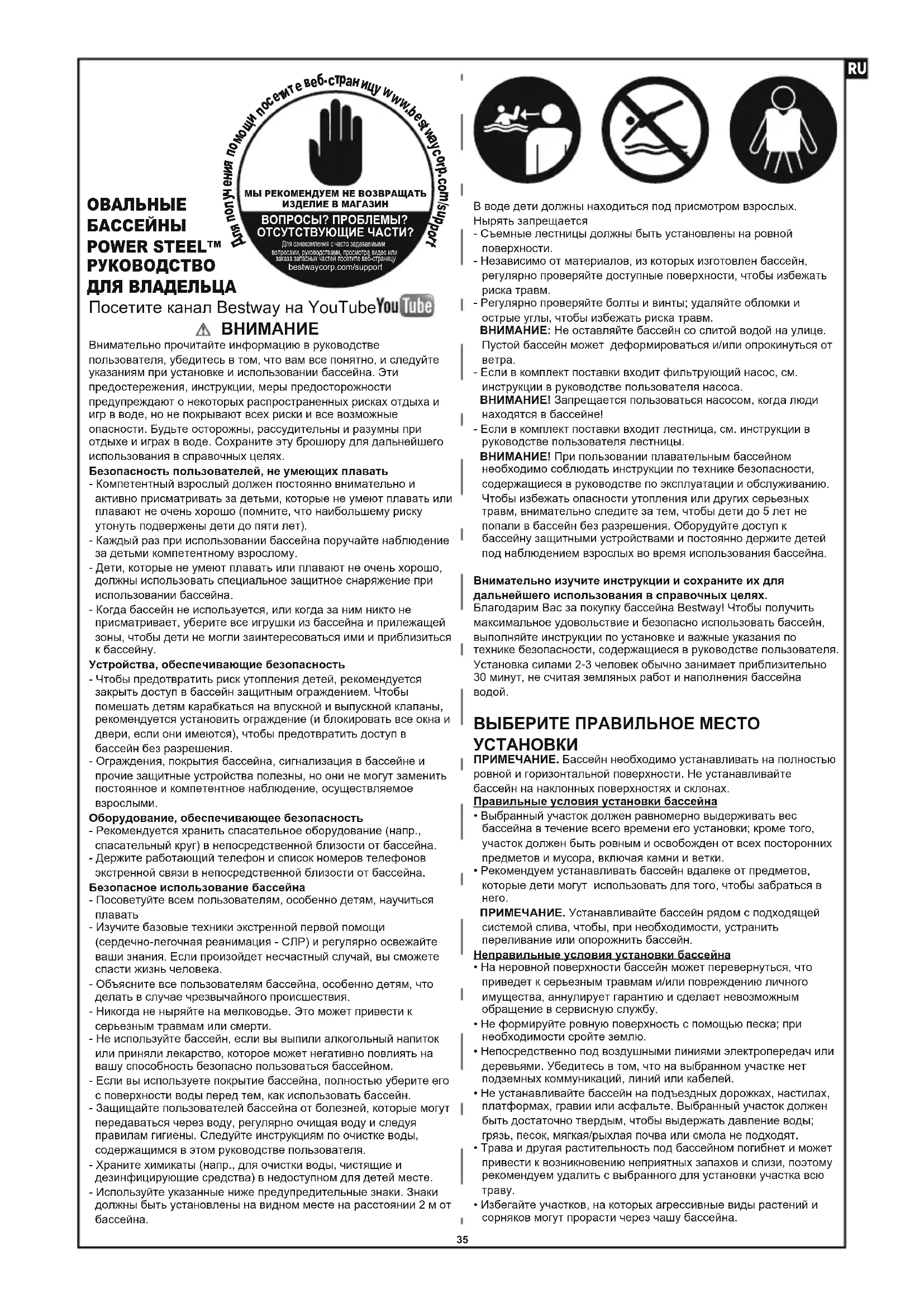 Внимательно прочитайте информацию в руководстве пользователя, убедитесь в том, что вам все понятно, и следуйте указаниям при установке и использовании бассейна. Эти предостережения, инструкции, меры предосторожности предупреждают о некоторых распространенных рисках отдыха и игр в воде, но не покрывают всех риски и все возможные опасности. Будьте осторожны, рассудительны и разумны при отдыхе и играх в воде. Сохраните эту брошюру для дальнейшего использования в справочных целях.Безопасность пользователей, не умеющих плавать- Компетентный взрослый должен постоянно внимательно и активно присматривать за детьми, которые не умеют плавать или плавают не очень хорошо (помните, что наибольшему риску утонуть подвержены дети до пяти лет).- Каждый раз при использовании бассейна поручайте наблюдение за детьми компетентному взрослому.- Дети, которые не умеют плавать или плавают не очень хорошо, должны использовать специальное защитное снаряжение при использовании бассейна.- Когда бассейн не используется, или когда за ним никто не присматривает, уберите все игрушки из бассейна и прилежащей зоны, чтобы дети не могли заинтересоваться ими и приблизиться к бассейну.Устройства, обеспечивающие безопасность- Чтобы предотвратить риск утопления детей, рекомендуется закрыть доступ в бассейн защитным ограждением. Чтобы помешать детям карабкаться на впускной и выпускной клапаны, рекомендуется установить ограждение (и блокировать все окна и двери, если они имеются), чтобы предотвратить доступ в бассейн без разрешения.- Ограждения, покрытия бассейна, сигнализация в бассейне и прочие защитные устройства полезны, но они не могут заменить постоянное и компетентное наблюдение, осуществляемое взрослыми.Оборудование, обеспечивающее безопасность- Рекомендуется хранить спасательное оборудование (напр., спасательный круг) в непосредственной близости от бассейна.- Держите работающий телефон и список номеров телефонов экстренной связи в непосредственной близости от бассейна.Безопасное использование бассейна- Посоветуйте всем пользователям, особенно детям, научиться плавать- Изучите базовые техники экстренной первой помощи (сердечно-легочная реанимация - СЛР) и регулярно освежайте ваши знания. Если произойдет несчастный случай, вы сможете спасти жизнь человека.- Объясните все пользователям бассейна, особенно детям, что делать в случае чрезвычайного происшествия.- Никогда не ныряйте на мелководье. Это может привести к серьезным травмам или смерти.- Не используйте бассейн, если вы выпили алкогольный напиток или приняли лекарство, которое может негативно повлиять на вашу способность безопасно пользоваться бассейном.- Если вы используете покрытие бассейна, полностью уберите его с поверхности воды перед тем, как использовать бассейн.- Защищайте пользователей бассейна от болезней, которые могут передаваться через воду, регулярно очищая воду и следуя правилам гигиены. Следуйте инструкциям по очистке воды, содержащимся в этом руководстве пользователя.- Храните химикаты (напр., для очистки воды, чистящие и дезинфицирующие средства) в недоступном для детей месте.- Используйте указанные ниже предупредительные знаки. Знаки должны быть установлены на видном месте на расстоянии 2 м от бассейна.В воде дети должны находиться под присмотром взрослых. Н