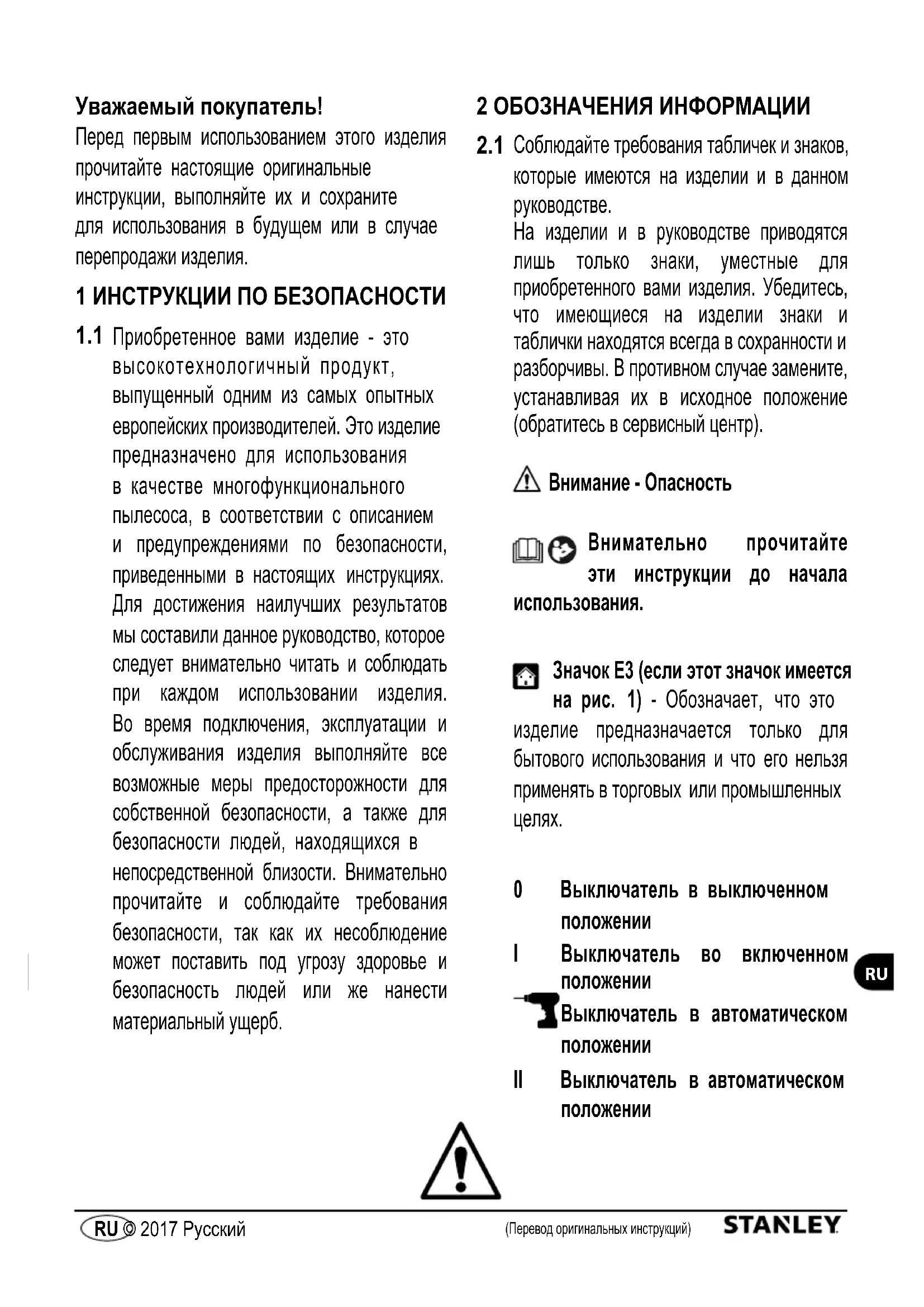 Скачайте инструкцию для вашего Пылесос в формате PDF бесплатно! Найдите своё руководство SXVC25PTDE - STANLEY и возьмите своё электронное устройство обратно в руки. На этой странице опубликованы все документы, необходимые для использования вашего устройства. SXVC25PTDE бренда STANLEY.