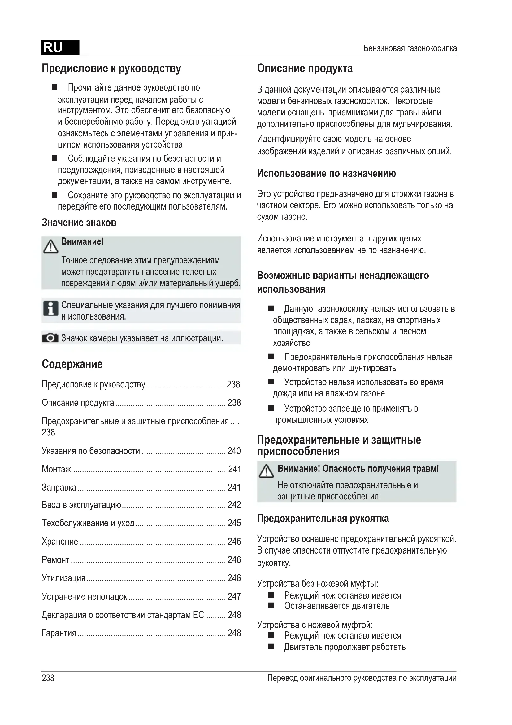 Предисловиекруководству .................................... 238 Описаниепродукта .................................................. 238 Предохранительныеизащитныеприспособления ....