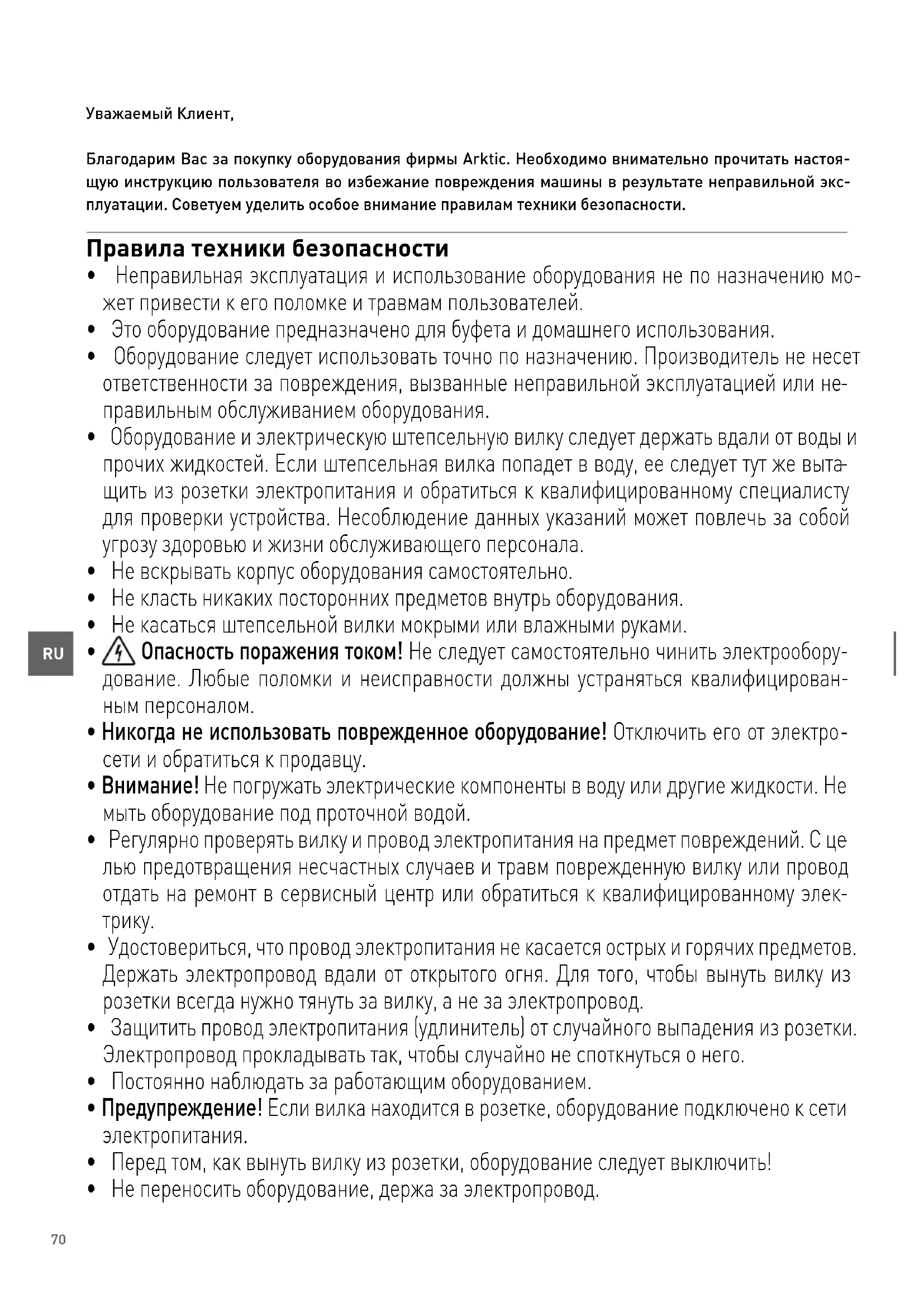 Уважаемый Клиент, Благодарим Вас за покупку оборудования фирмы Arktic. Необходимо внимательно прочитать настоя- щую инструкцию пользователя во избежание повреждения машины в результате неправильной экс- плуатации. Советуем уделить особое внимание правилам техники безопасности. Правила техники безопасности