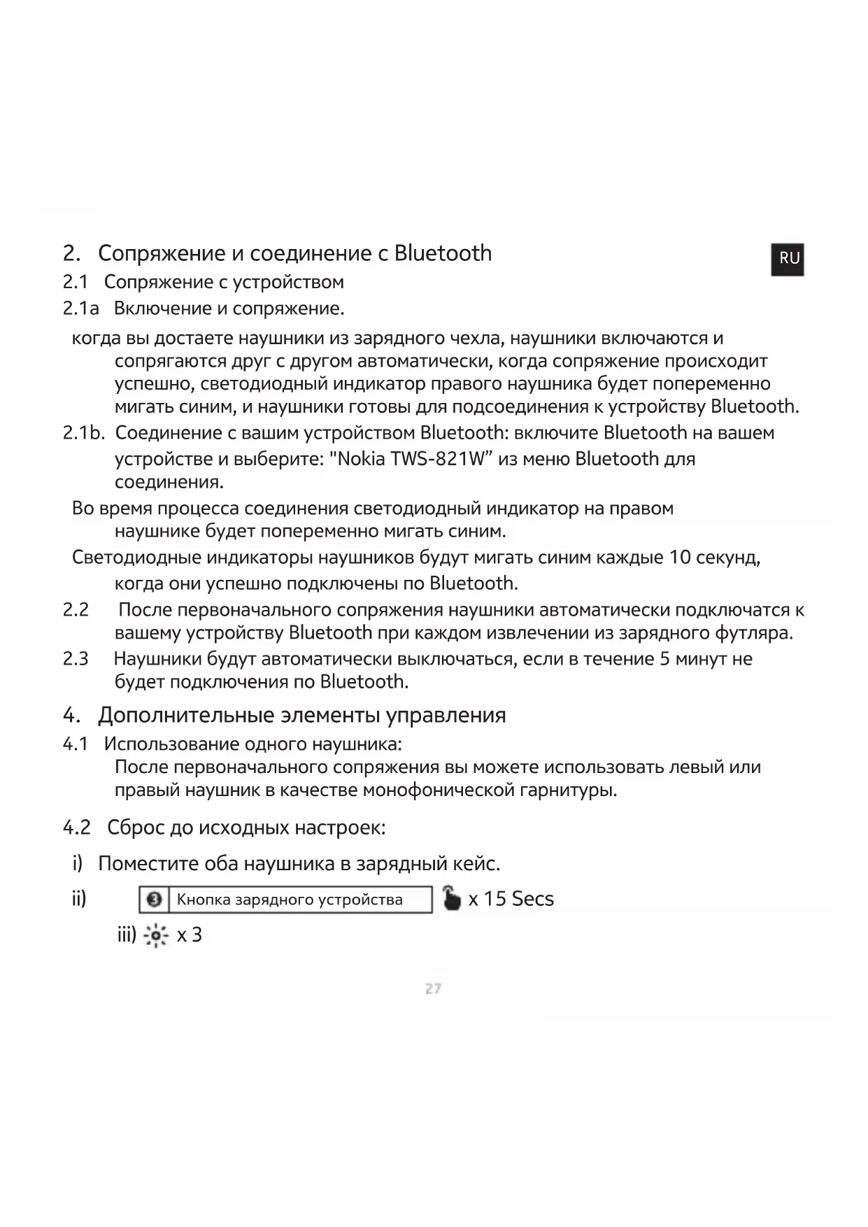 2.1a Включение и сопряжение. когда вы достаете наушники из зарядного чехла, наушники включаются и сопрягаются друг с другом автоматически, когда сопряжение происходит успешно, светодиодный индикатор правого наушника будет попеременно мигать синим, и наушники готовы для подсоединения к устройству Bluetooth. 2.1b. Соединение с вашим устройством Bluetooth: включите Bluetooth на вашем устройстве и выберите: "Nokia TWS-821W” из меню Bluetooth для соединения. Во время процесса соединения светодиодный индикатор на правом наушнике будет попеременно мигать синим. Светодиодные индикаторы наушников будут мигать синим каждые 10 секунд, когда они успешно подключены по Bluetooth.