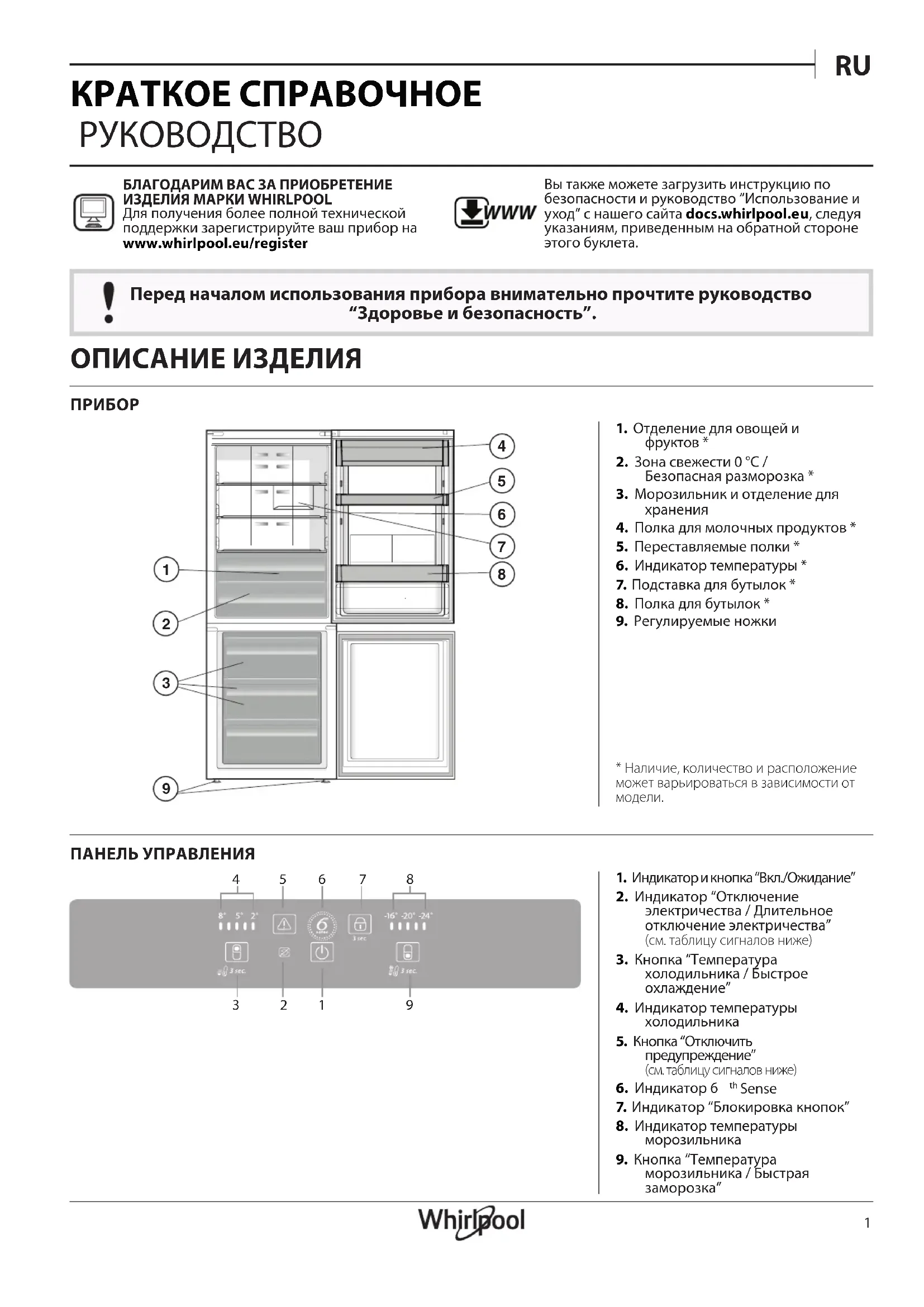 1. Индикатор и кнопка “Вкл./Ожидание”2. Индикатор “Отключение электричества / Длительное отключение электричества” (см. таблицу сигналов ниже)3. Кнопка “Температура холодильника / Быстрое охлаждение”4. Индикатор температуры холодильника5. Кнопка “Отключить предупреждение” (см. таблицу сигналов ниже)6. Индикатор 6 Sense7. Индикатор “Блокировка кнопок” 8. Индикатор температуры морозильника9. Кнопка “Температура морозильника / Быстрая заморозка” ОПИСАНИЕ ИЗДЕЛИЯ КРАТКОЕ СПРАВОЧНОЕ РУКОВОДСТВО Перед началом использования прибора внимательно прочтите руководство “Здоровье и безопасность”. БЛАГОДАРИМ ВАС ЗА ПРИОБРЕТЕНИЕ ИЗДЕЛИЯ МАРКИ WHIRLPOOLДля получения более полной технической поддержки зарегистрируйте ваш прибор на www . whirlpool . eu / register WWW Вы также можете загрузить инструкцию по безопасности и руководство “Использование и уход” с нашего сайта docs.whirlpool.eu, следуя указаниям, приведенным на обратной стороне этого буклета.