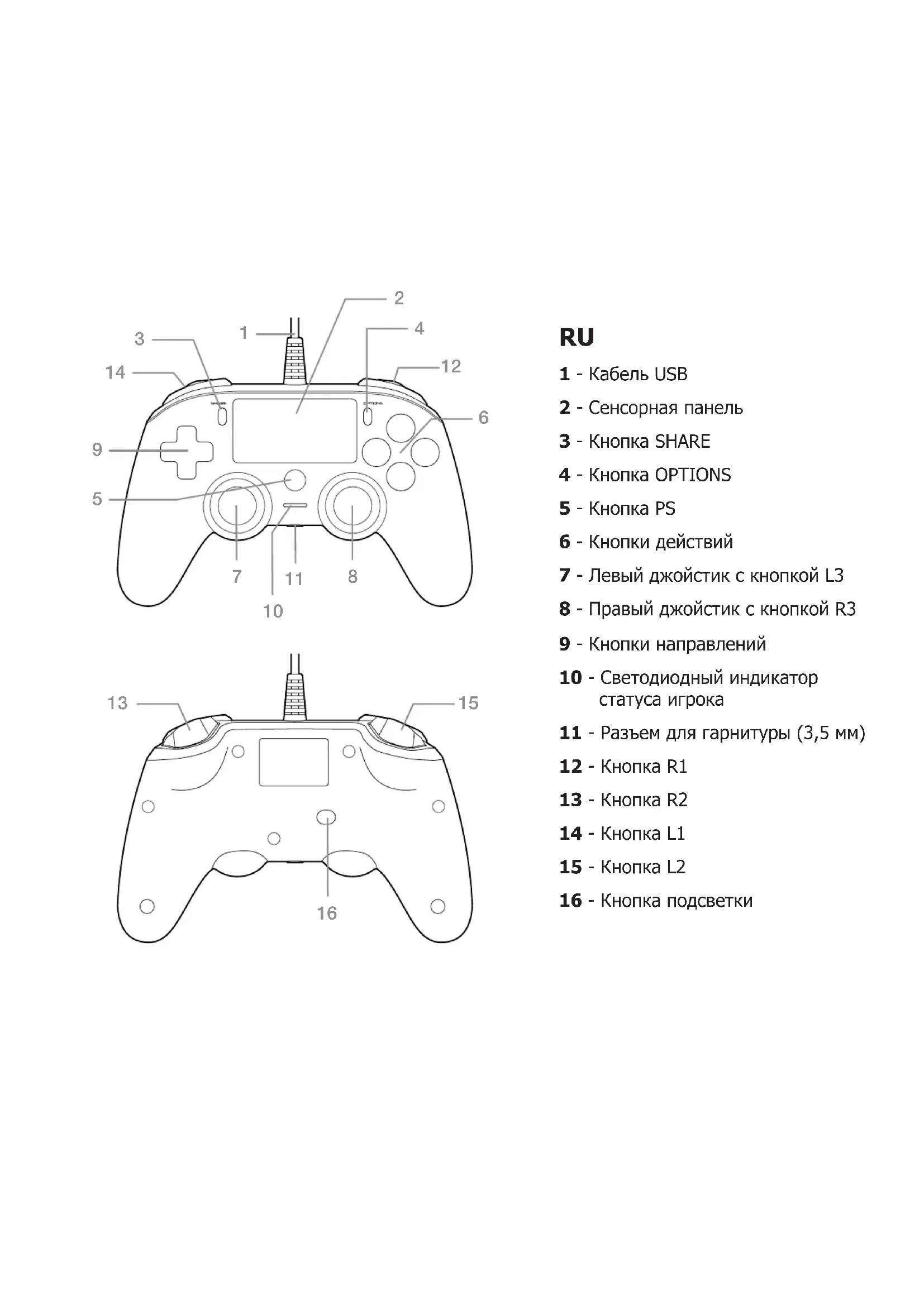 Этот продукт с торговой маркой NACON имеет гарантию производителя сроком на 2 года с момента приобретения, в течение которого продукт может быть бесплатно обменян на такую же или схожую модель, на наше усмотрение, при наличии дефектов материала или сборки. Гарантия не распространяется на устройства, получившие повреждения вследствие износа и нарушения условий эксплуатации. Гарантия предоставляется только покупателю продукта. Это не касается ваших законных прав. Использование Подключите кабель USB вашего контроллера WIRED COMPACT CONTROLLER к одному из свободных портов вашей системы. Примечание: Обратите внимание, что в данном контроллере не поддерживаются следующие функции беспроводного контроллера DUALSHOCK®4: встроенный динамик, световая панель, а также функция встроенного датчика беспроводного контроллера SIXAXIS™. Задняя подсветка Ваш контроллер оснащен диодной задней подсветкой, которая в сочетании с прозрачным чехлом создает свечение во время игры. Чтобы включить или выключить эффект, нажмите кнопку на задней стороне контроллера. Примечание: Светодиоды не имеют функции с PlayStation