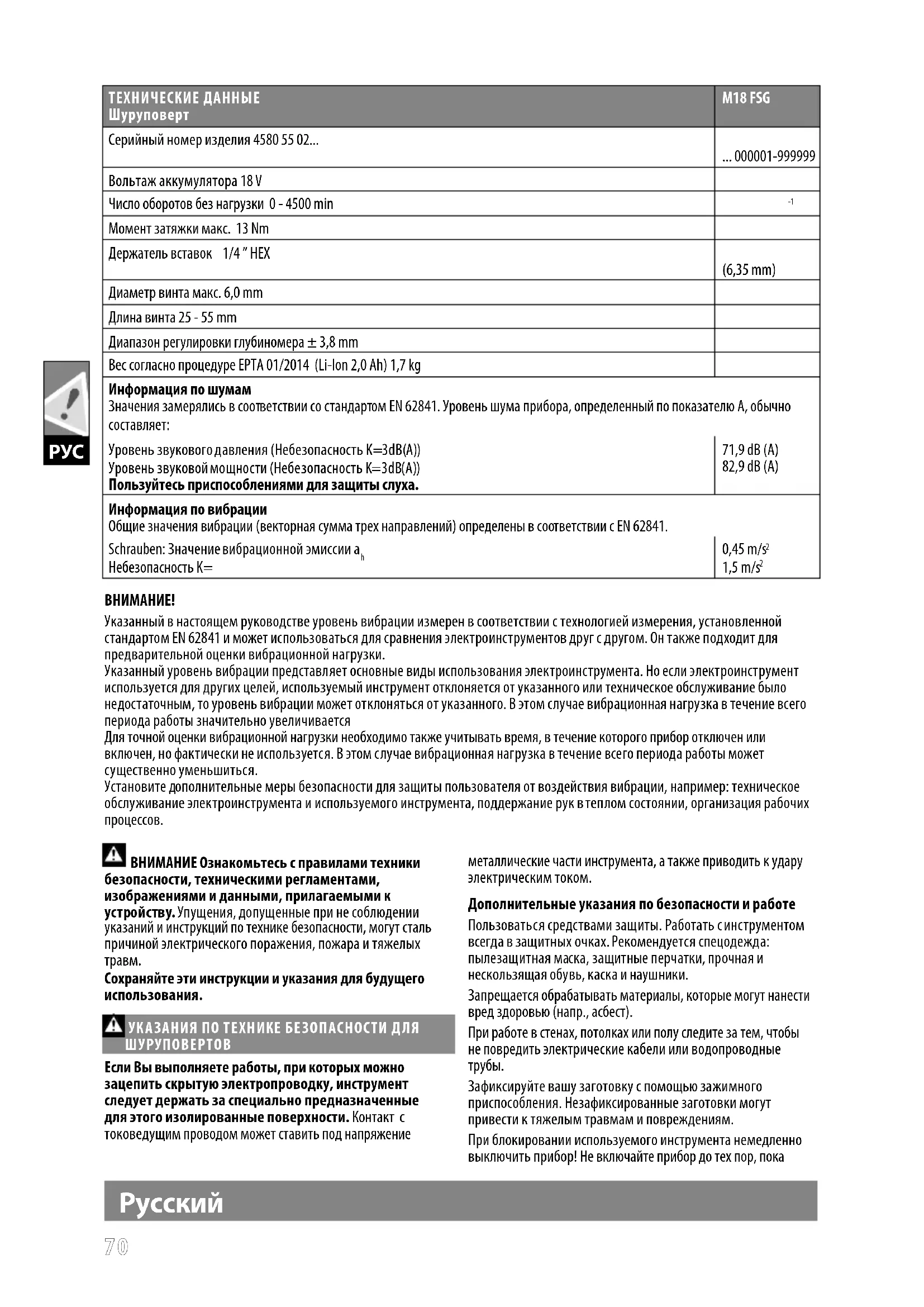 M18 FSG Серийный номер изделия 4580 55 02... ... 000001-999999 Bольтаж аккумулятора 18 V Число оборотов без нагрузки 0 - 4500 min
