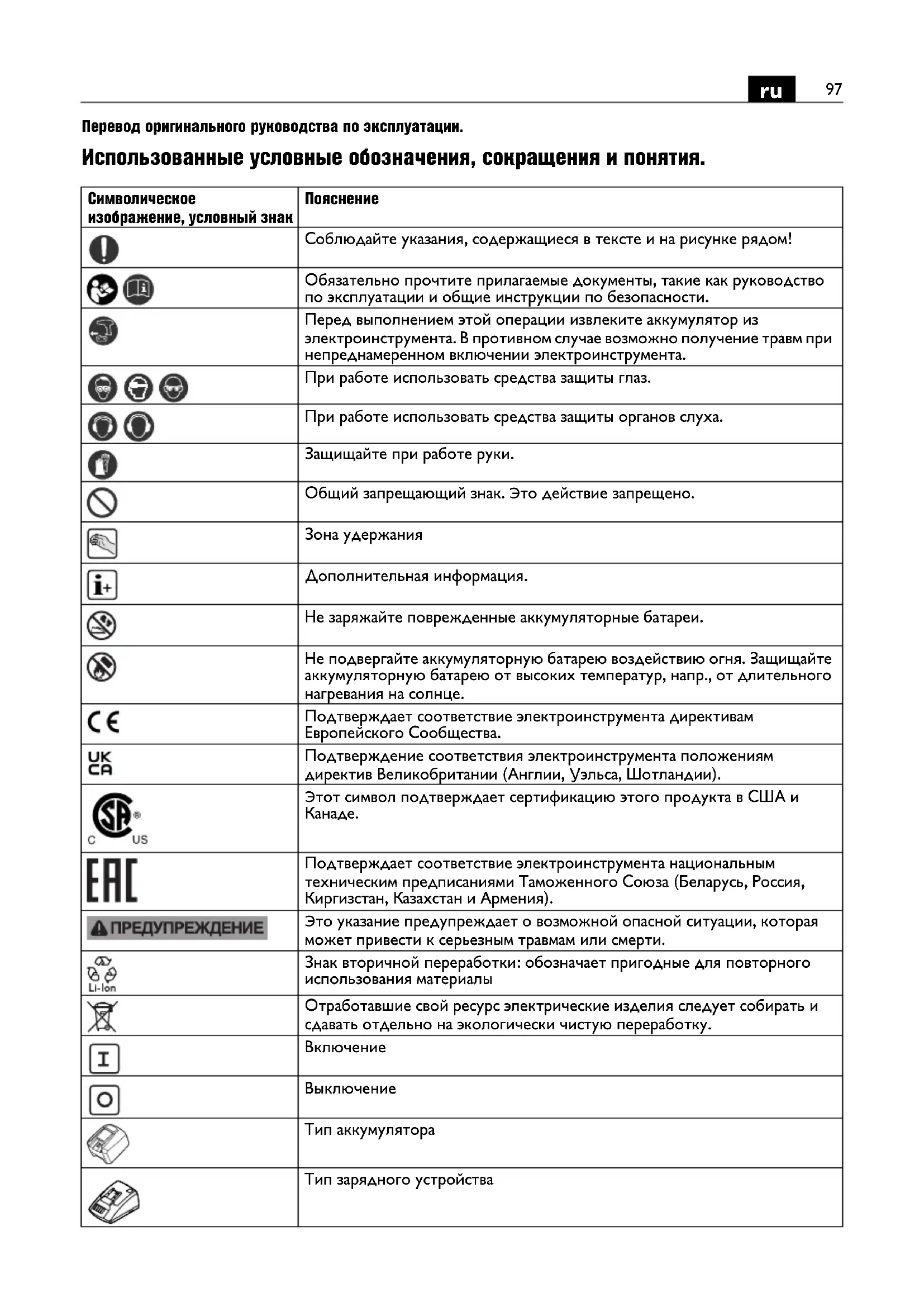 Соблюдайте указания, содержащиеся в тексте и на рисунке рядом! Обязательно прочтите прилагаемые документы, такие как руководство по эксплуатации и общие инструкции по безопасности. Перед выполнением этой операции извлеките аккумулятор из электроинструмента. В противном случае возможно получение травм при непреднамеренном включении электроинструмента. При работе использовать средства защиты глаз. При работе использовать средства защиты органов слуха. Защищайте при работе руки. Общий запрещающий знак. Это действие запрещено. Зона удержания Дополнительная информация. Не заряжайте поврежденные аккумуляторные батареи. Не подвергайте аккумуляторную батарею воздействию огня. Защищайте аккумуляторную батарею от высоких температур, напр., от длительного нагревания на солнце. Подтверждает соответствие электроинструмента директивам Европейского Сообщества. Подтверждение соответствия электроинструмента положениям директив Великобритании (Англии, Уэльса, Шотландии). Этот символ подтверждает сертификацию этого продукта в США и