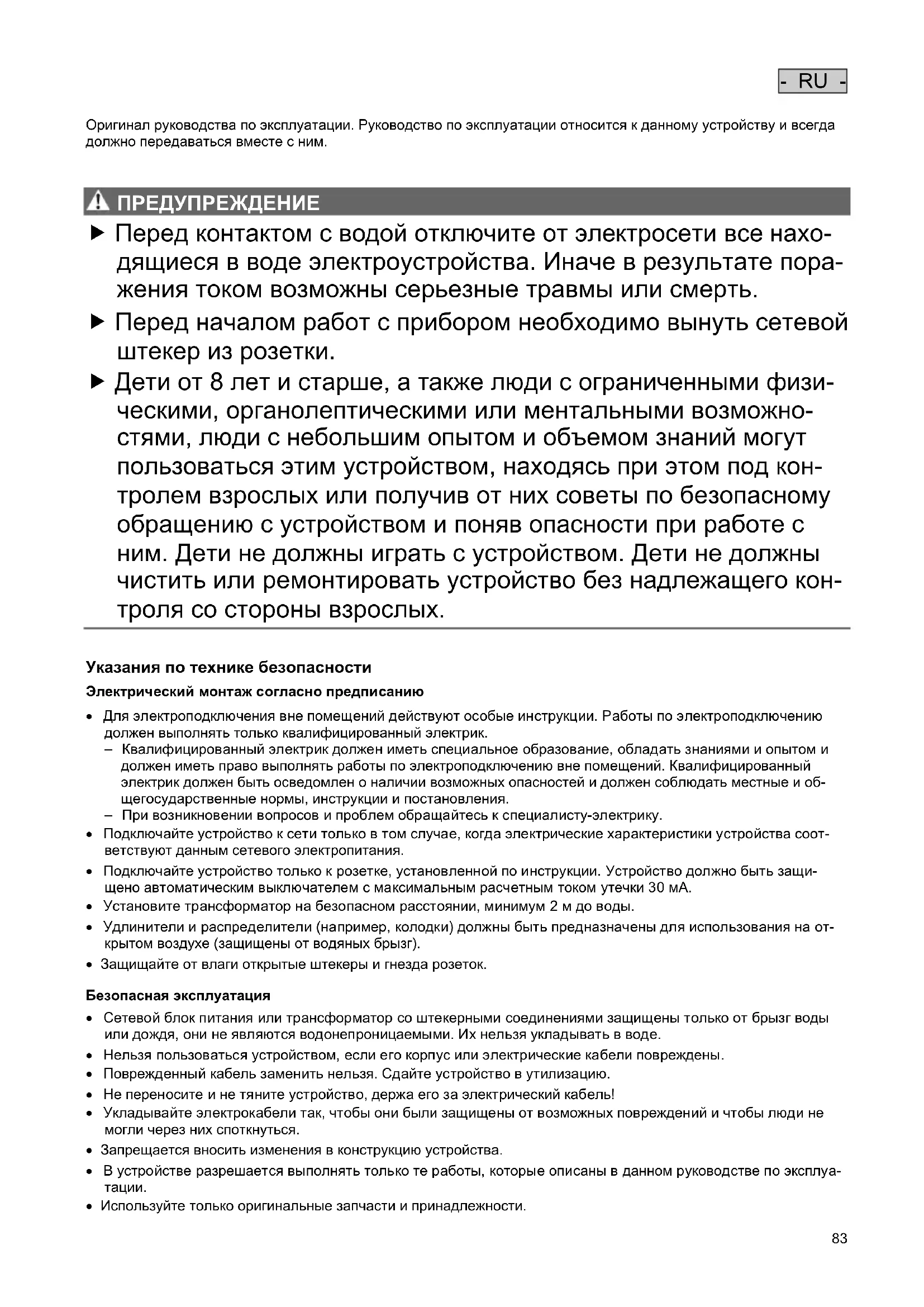 ПРЕДУП РЕ ЖДЕНИ Е ПРЕДУПРЕЖДЕНИЕ Перед контактом с водой отключите от электросети все нахо- дящиеся в воде электроустройства. Иначе в результате пора- жения током возможны серьезные травмы или смерть. Перед началом работ с прибором необходимо вынуть сетевой штекер из розетки. Дети от 8 лет и старше, а также люди с ограниченными физи- ческими, органолептическими или ментальными возможно- стями, люди с небольшим опытом и объемом знаний могут пользоваться этим устройством, находясь при этом под кон- тролем взрослых или получив от них советы по безопасному обращению с устройством и поняв опасности при работе с ним. Дети не должны играть с устройством. Дети не должны чистить или ремонтировать устройство без надлежащего кон- троля со стороны взрослых.
