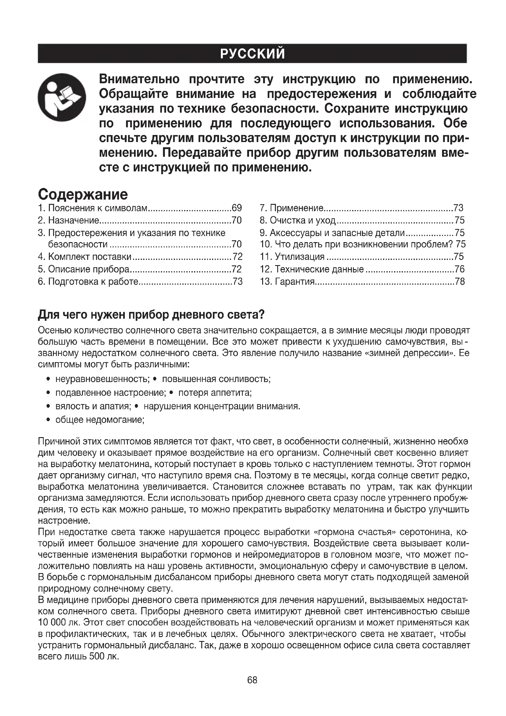 спечьте другим пользователям доступ кинструкции попри- менению. Передавайте прибор другим пользователям вме- сте синструкцией поприменению. Для чего нужен прибор дневного света? Осенью количество солнечного света значительно сокращается, авзимние месяцы люди проводят большую часть времени впомещении. Все это может привести кухудшению самочувствия, вы