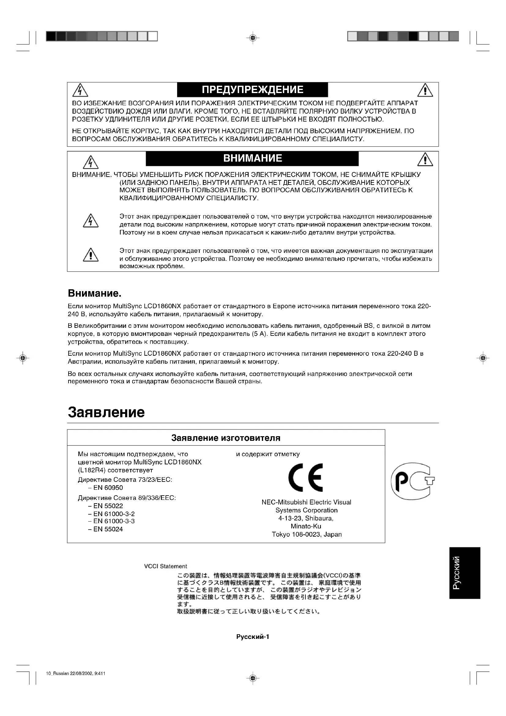 Заявление изготовителя Мы настоящим подтверждаем, что цветной монитор MultiSync LCD1860NX (L182R4) соответствует Директиве Совета 73/23/EEC: – EN 60950 Директиве Совета 89/336/EEC: – EN 55022 – EN 61000-3-2 – EN 61000-3-3 – EN 55024 и содержит отметку NEC-Mitsubishi Electric Visual Systems Corporation 4-13-23, Shibaura, Minato-Ku Tokyo 108-0023, Japan 10_Russian 22/08/2002, 9:411Русский-2 MultiSync LCD1860NX