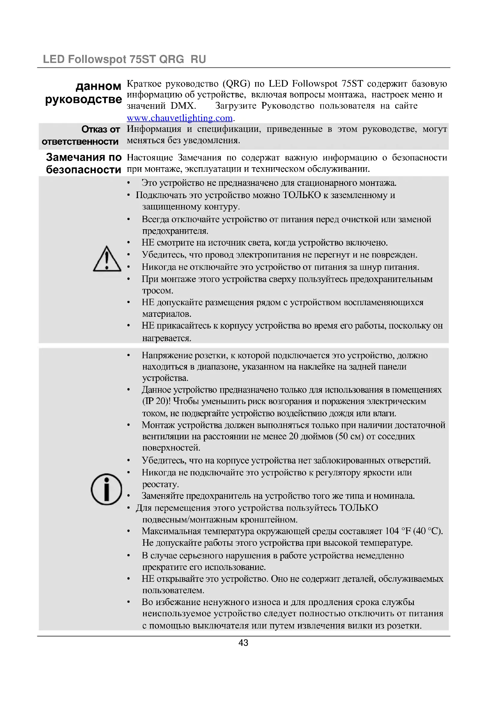 РУКОВОДСТВО ПОЛЬЗОВАТЕЛЯ LED Followspot 75ST Chauvet