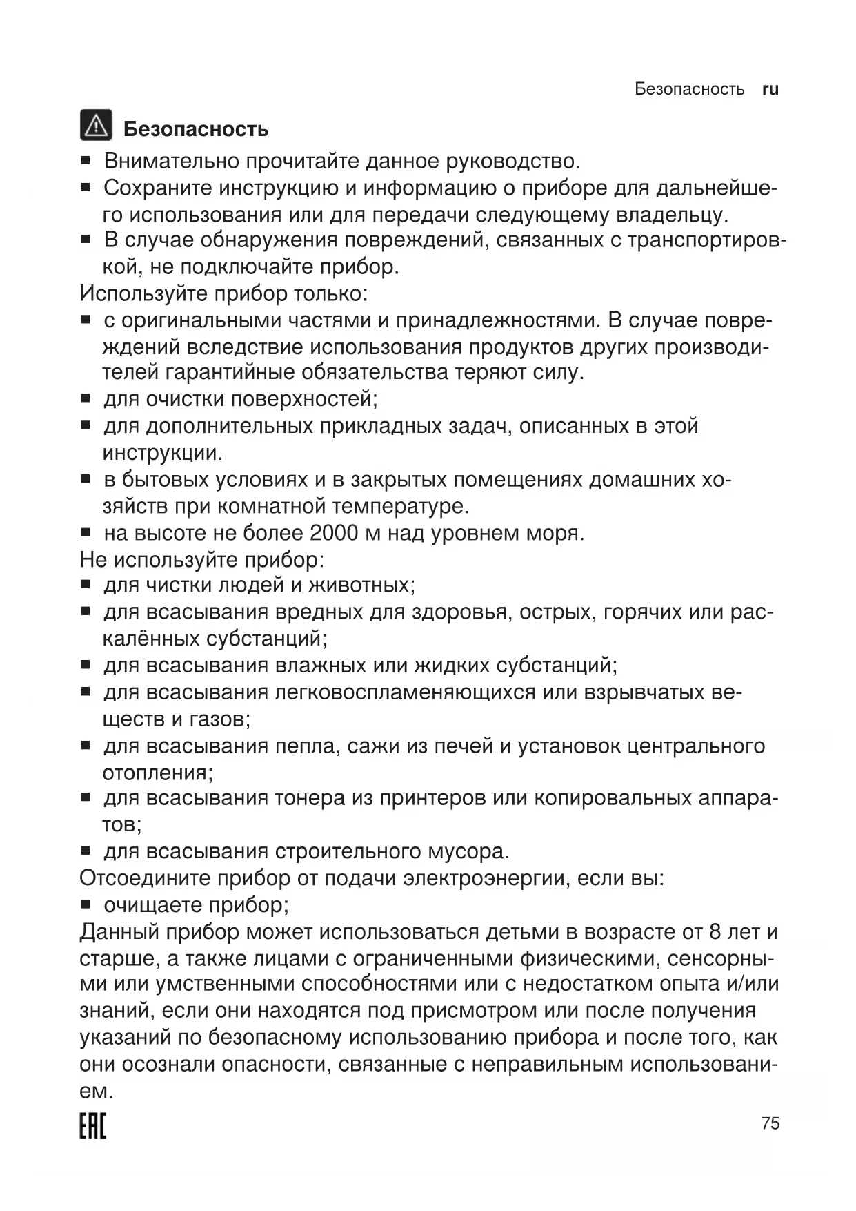 ¡ для всасывания строительного мусора. Отсоедините прибор от подачи электроэнергии, если вы: ¡ очищаете прибор; Данный прибор может использоваться детьми в возрасте от 8 лет и старше, а также лицами с ограниченными физическими, сенсорны- ми или умственными способностями или с недостатком опыта и/или знаний, если они находятся под присмотром или после получения указаний по безопасному использованию прибора и после того, как они осознали опасности, связанные с неправильным использовани- ем.ru Безопасность