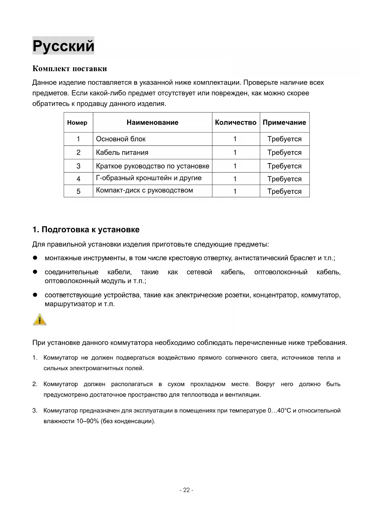 Для правильной установки изделия приготовьте следующие предметы: монтажные инструменты, в том числе крестовую отвертку, антистатический браслет и т.п.; соединительные кабели, такие как сетевой кабель, оптоволоконный кабель, оптоволоконный модуль и т.п.; соответствующие устройства, такие как электрические розетки, концентратор, коммутатор, маршрутизатор и т.п. При установке данного коммутатора необходимо соблюдать перечисленные ниже требования.