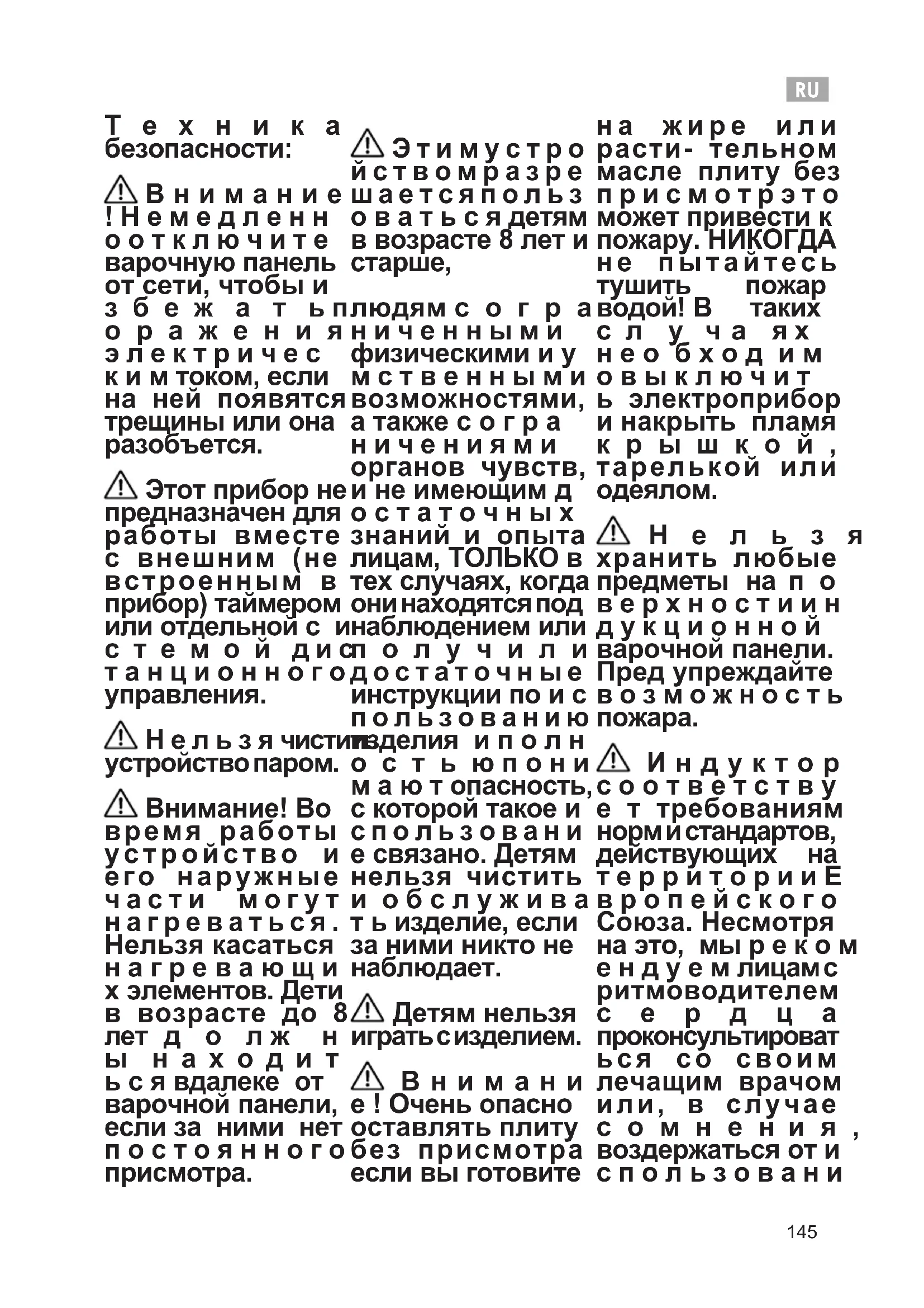 безопасности: В н и м а н и е ! Н е м е д л е н н о о т к л ю ч и т е варочную панель от сети, чтобы и з б е ж а т ь п о р а ж е н и я э л е к т р и ч е с к и м током, если на ней появятся трещины или она разобъется. Этот прибор не предназначен для работы вместе с внешним (не встроенным в прибор) таймером или отдельной с и с т е м о й д и с т а н ц и о н н о г о управления. Н е л ь з я чистить устройство паром. Внимание! Во время работы устройство и его наружные части могут нагреваться. Нельзя касаться н а г р е в а ю щ и х элементов. Дети в возрасте до 8 лет д о л ж н ы н а х о д и т ь с я вдалеке от варочной панели, если за ними нет п о с т о я н н о г о