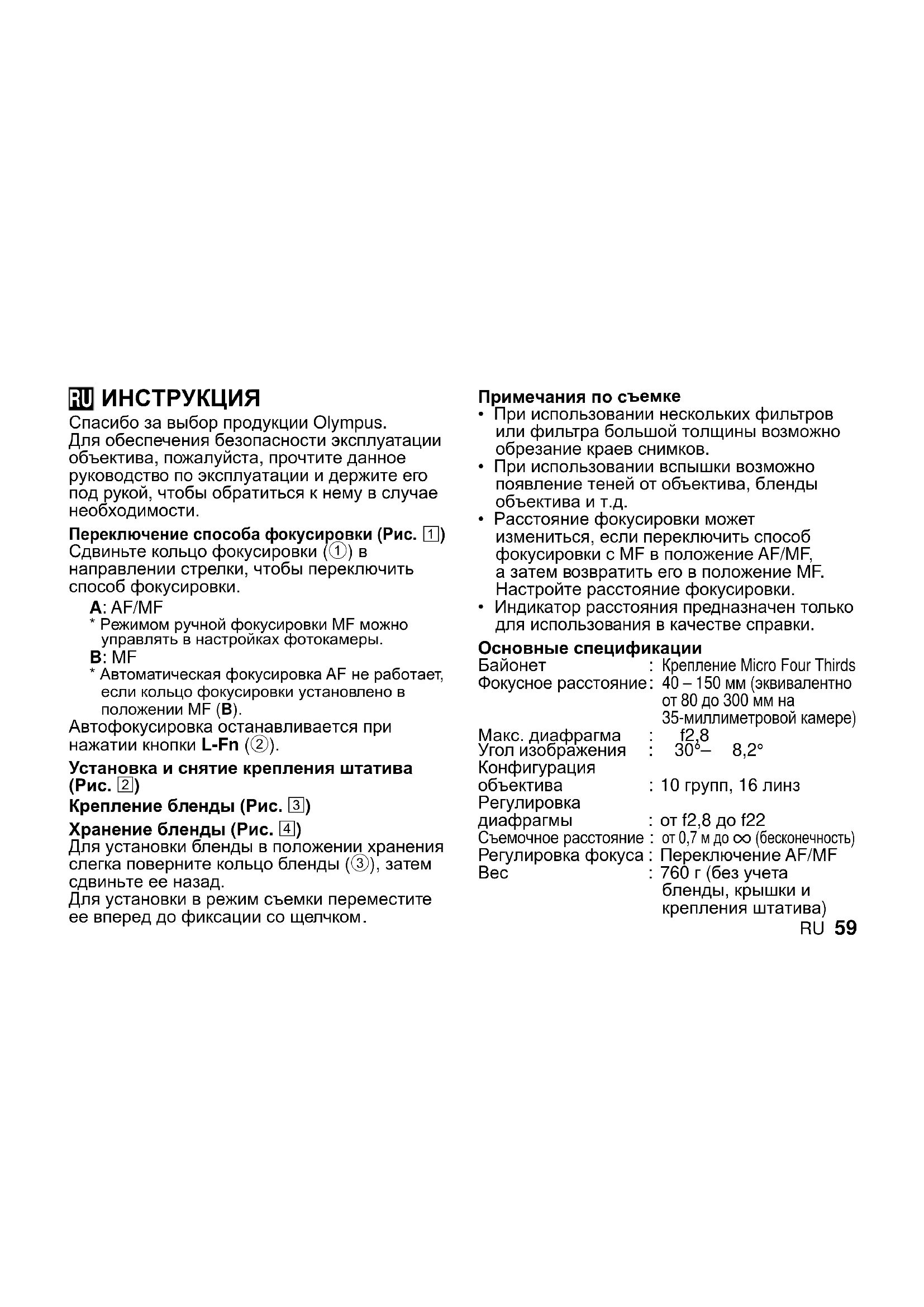 Спасибо за выбор продукции Olympus. Для обеспечения безопасности эксплуатации объектива, пожалуйста, прочтите данное руководство по эксплуатации и держите его под рукой, чтобы обратиться к нему в случае необходимости. Переключение способа фокусировки (Рис.