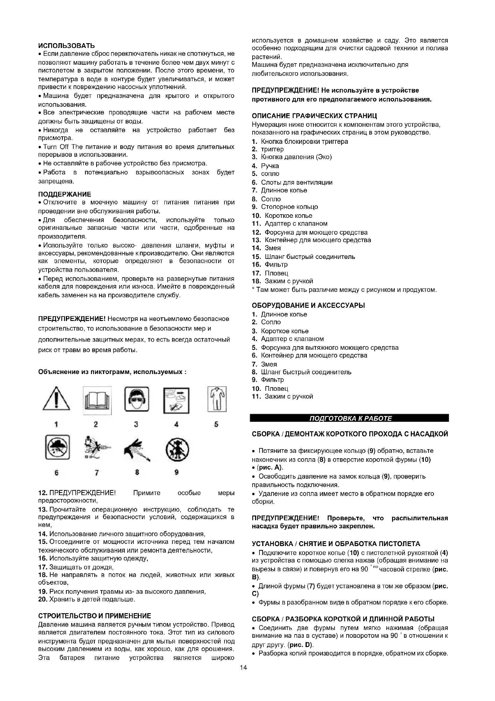 ПРЕДУПРЕЖДЕНИЕ! При использовании в воду (питьевая сети), чтобы убедиться, что вода питание будет заблокировано (для примера с помощью адаптера клапана (11)), когда не используя в душ. Это предотвращает моющее средство от опорожнения резервуара. ПРЕДУПРЕЖДЕНИЕ! Давление машины была предназначено для работы с очищающими агентами рекомендуется от производителя. Использование из других чистящих агентов может отрицательно повлиять на безопасность этого прибора. Не используйте в качестве чистящего средства кислоты, бензин, керосин или другие горючие жидкости. Только бытовые моющие средства (р Н 6-8) могут быть использованы. УХОД И ОБСЛУЖИВАНИЕ ПРЕДУПРЕЖДЕНИЕ! Перед началом каких - либо установки, регулировки, ремонта или технического обслуживания деятельности, снимите на батарею из устройства. ОБСЛУЖИВАНИЕ И ХРАНЕНИЕ