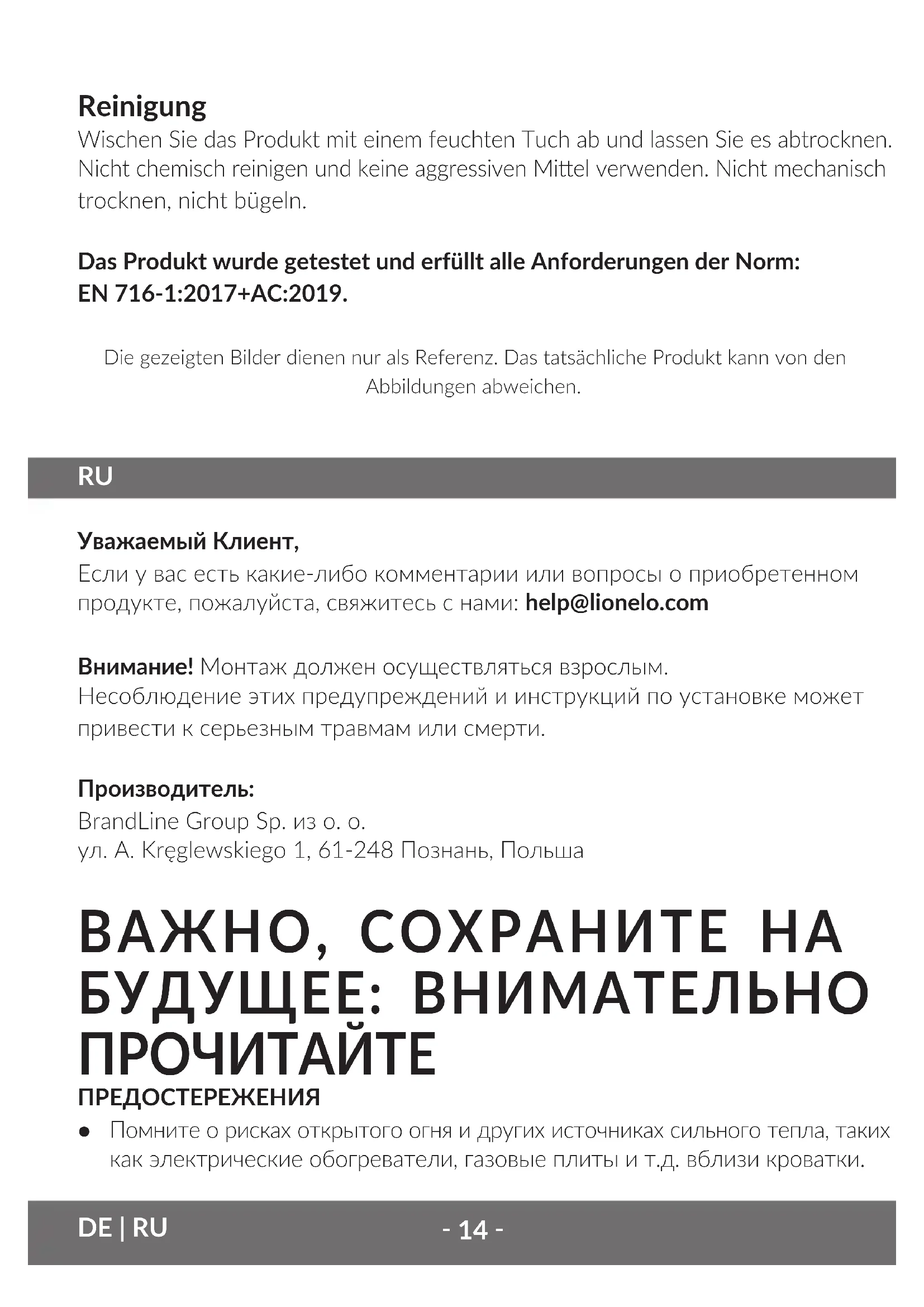 Уважаемый Клиент, Если у вас есть какие-либо комментарии или вопросы о приобретенном продукте, пожалуйста, свяжитесь с нами: help@lionelo.com Внимание! Монтаж должен осуществляться взрослым. Несоблюдение этих предупреждений и инструкций по установке может привести к серьезным травмам или смерти. Производитель: BrandLine Group Sp. из о. о. ул. A. Kręglewskiego 1, 61-248 Познань, Польша ВАЖНО, СОХРАНИТЕ НА БУДУЩЕЕ: ВНИМАТЕЛЬНО