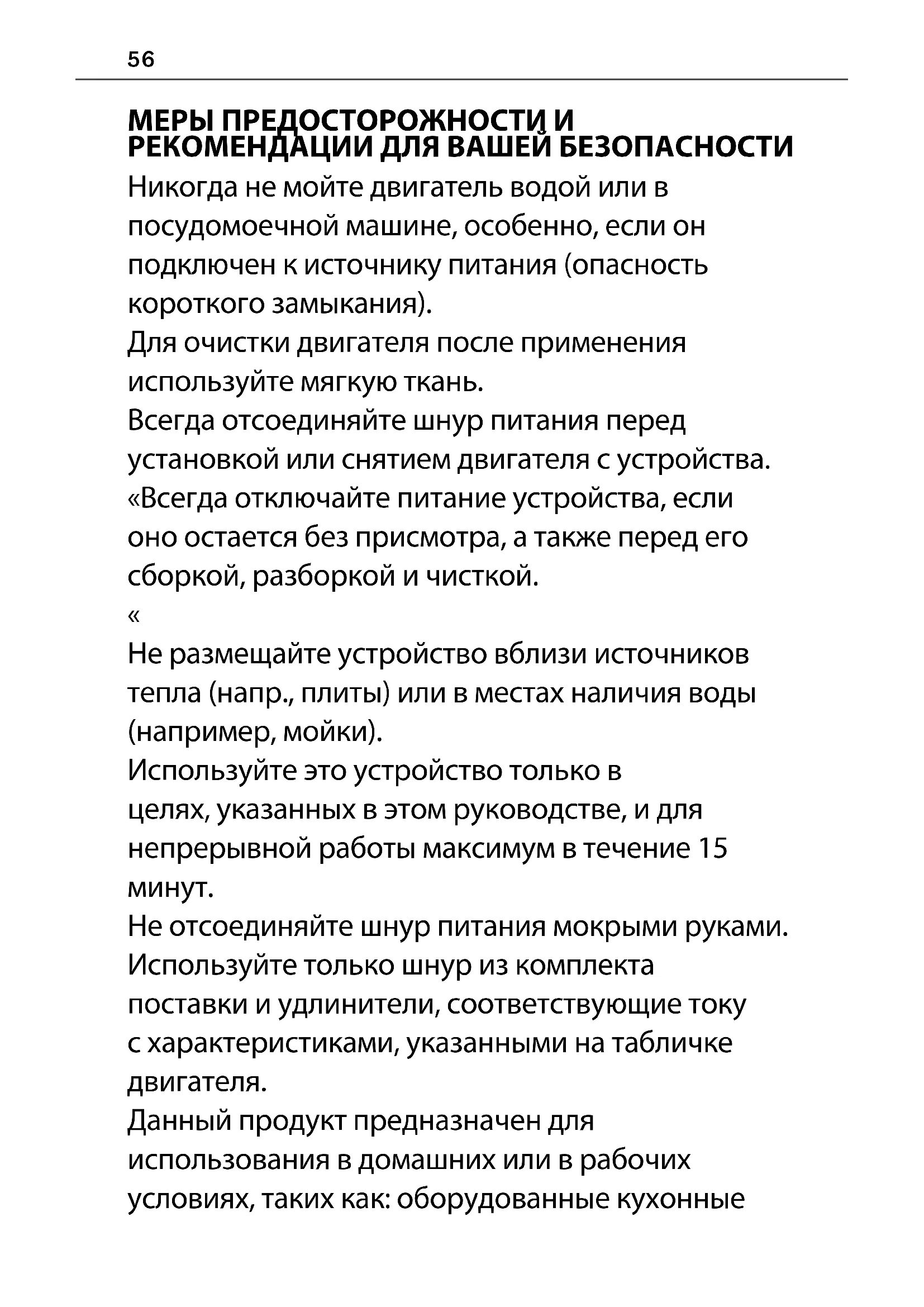 Не размещайте устройство вблизи источников тепла (напр., плиты) или в местах наличия воды (например, мойки). Используйте это устройство только в целях, указанных в этом руководстве, и для непрерывной работы максимум в течение 15