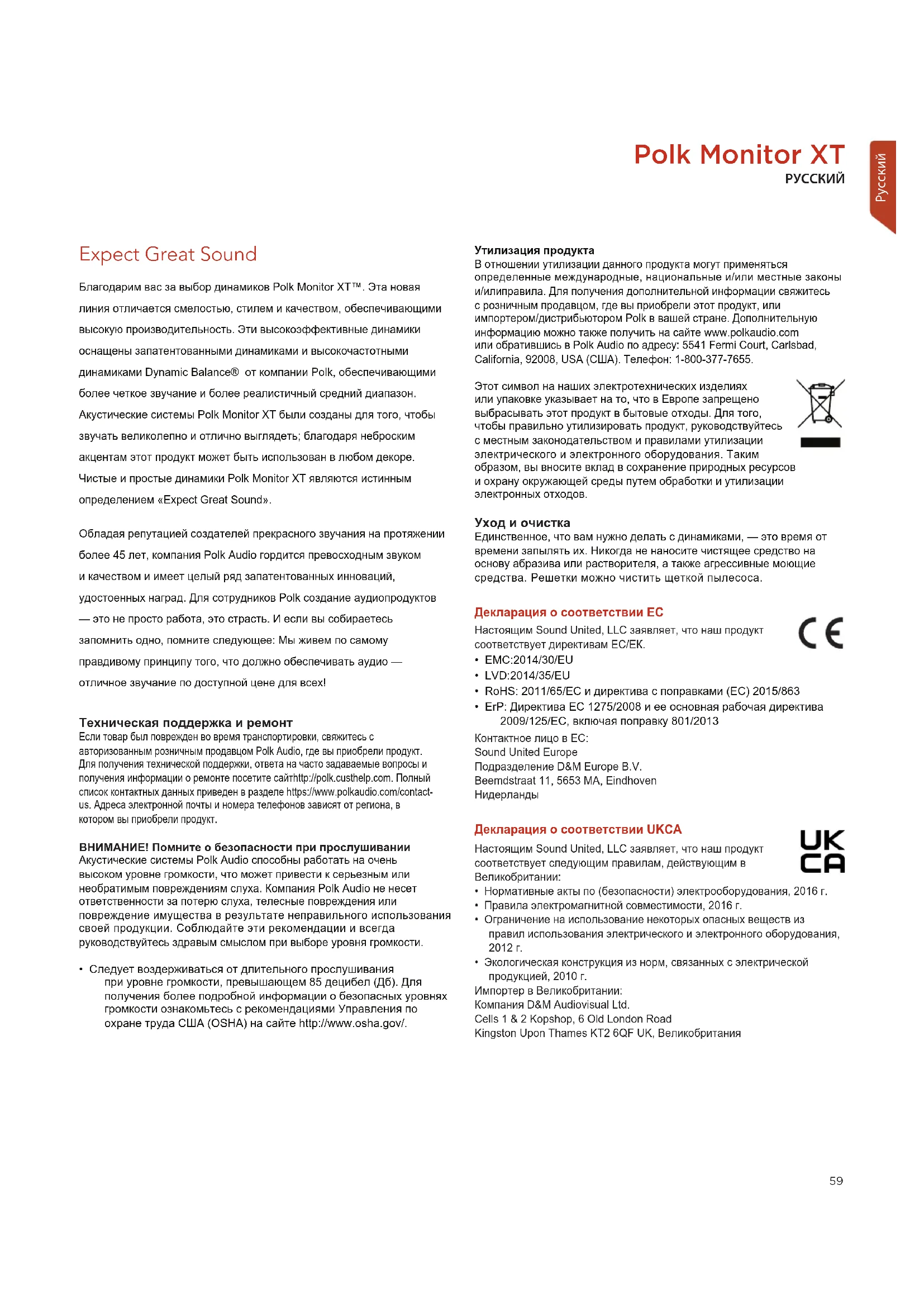 - Следует воздерживаться от длительного прослушивания при уровне громкости, превышающем 85 децибел (Дб). Для получения более подробной информации о безопасных уровнях громкости ознакомьтесь с рекомендациями Управления по охране труда США (OSHA) на сайте http://www.osha.gov/. Утилизация продукта В отношении утилизации данного продукта могут применяться определенные международные, национальные и/или местные законы и/илиправила. Для получения дополнительной информации свяжитесь с розничным продавцом, где вы приобрели этот продукт, или импортером/дистрибьютором Polk в вашей стране. Дополнительную информацию можно также получить на сайте www.polkaudio.com или обратившись в Polk Audio по адресу: 5541 Fermi Court, Carlsbad, California, 92008, USA (США). Телефон: 1-800-377-7655. Этот символ на наших электротехнических изделиях или упаковке указывает на то, что в Европе запрещено выбрасывать этот продукт в бытовые отходы. Для того, чтобы правильно утилизировать продукт, руководствуйтесь с местным законодательством и правилами утилизации электрического и электронного оборудования. Таким образом, вы вносите вклад в сохранение природных ресурсов и охрану окружающей среды путем обработки и утилизации электронных отходов. Уход и очистка Единственное, что вам нужно делать с динамиками, — это время от времени запылять их. Никогда не наносите чистящее средство на основу абразива или растворителя, а также агрессивные моющие средства. Решетки можно чистить щеткой пылесоса. Декларация о соответствии ЕС Настоящим Sound United, LLC заявляет, что наш продукт соответствует директивам ЕС/ЕК.